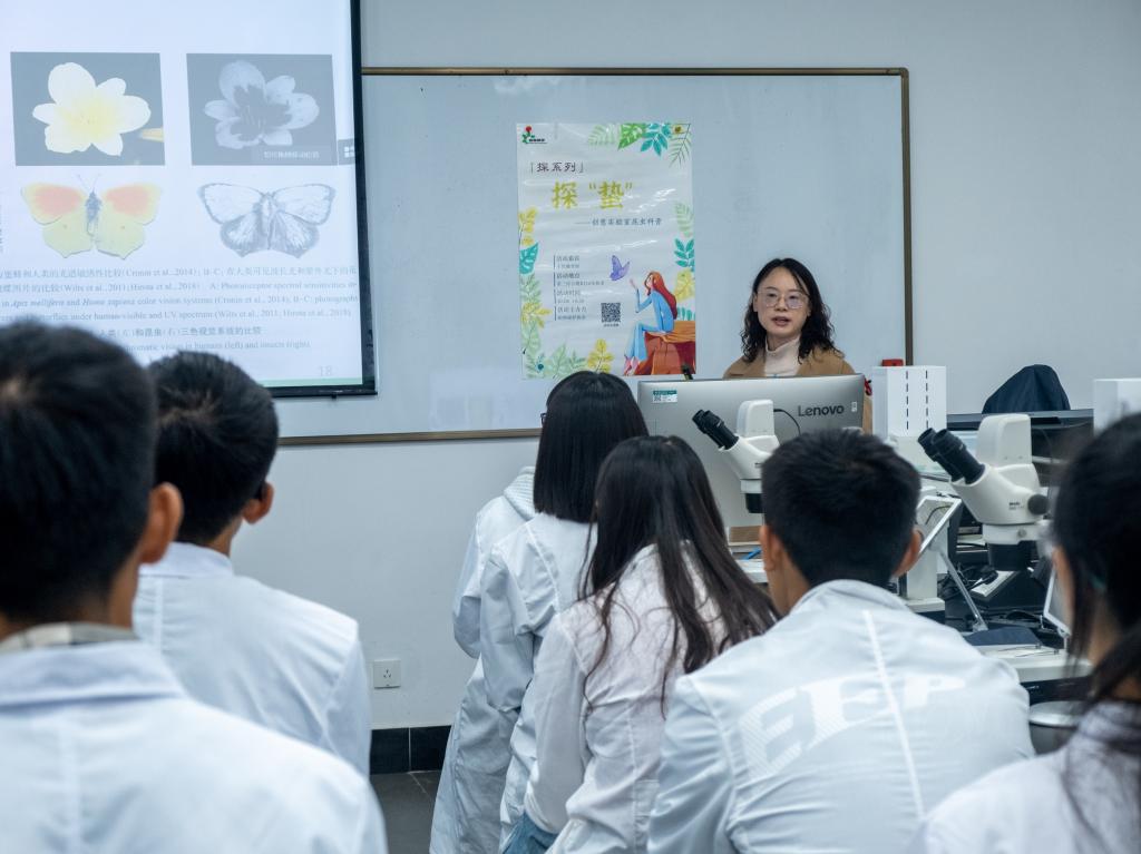 昆虫教研组与植物保护协会联合策办的探“蛰”主题科普活动于第三综合楼B216实验室成功举办。昆虫教研组王佳璐老师以昆虫求生觅食的本能反应为引,带领同学们一步步向后追问,揭开昆虫基础研究的神秘面纱。