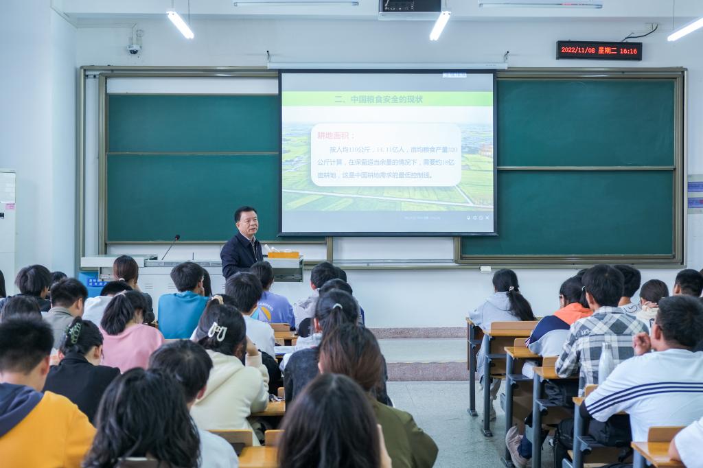 118日下午,校党委副书记、副校长姚江林为91免费版 2022级学生讲授形势政策课。姚江林以“粮食安全与农大责任”为题,围绕粮食安全的内涵、中国粮食安全的现状、粮食安全面对的危机、中国农业科技创新现状以及农大学子的责任和使命五个部分进行讲述。