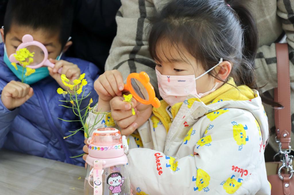 “如何科学观察油菜呢?”在实践部分,王家丽带领大家通过解剖实验看到了油菜花真正的样子。在自己动手和家长协助下,每位小朋友通过自己手中的几朵油菜花、镊子、放大镜等观察材料直接观察到了油菜花的组成结构,认识了萼片、花瓣、雌蕊、雄蕊等结构的模样与位置,并在随后的“对号入座”游戏中成功的对应了结构与名称。为了让大家更加近距离的观察油菜花,探索不同油菜花之间的区别,活动安排大家走出教室,来到油菜花田,亲身感受春天的油菜花开。在观察油菜花结构之外,参与的家庭纷纷在美丽的油菜花田旁合影留念,现场氛围轻松愉快。