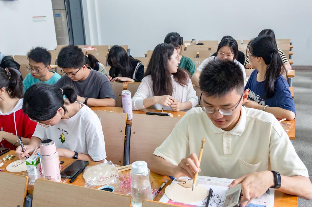 “翰墨飘香,万物可书 ”、工作人员首先向大家介绍了制作团扇的材料、制作技巧和注意事项并演示团扇的制作方法。随后又向大家提供了团扇及毛笔、墨水、中性笔等绘制工具。在工作人员的指导帮助下,同学们摩拳擦掌,提笔欲试。调配浓淡适宜的墨水、固定干花装饰物、绘制喜爱的图案……同学们充分发挥自己的艺术细胞和创造力,不一会儿,数十个精致而独特的团扇就在同学们的相互配合下完成了,扇面上几句古诗词、一幅幅山水画在同学们巧手的执笔下“跃然纸上”,现场墨香浓郁,同学们仿佛沉浸在笔墨的海洋中。