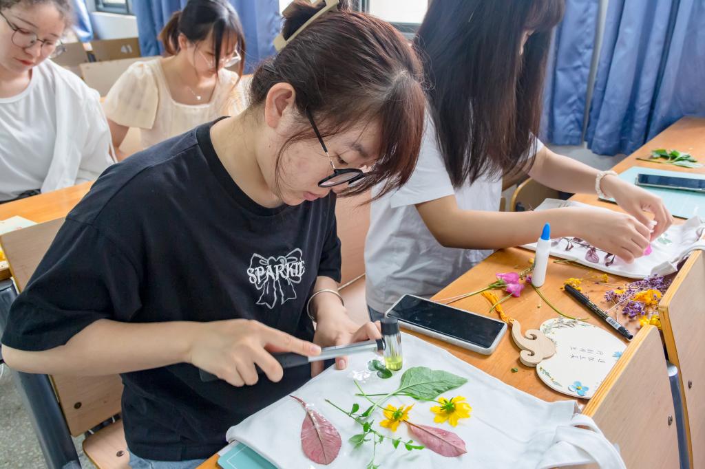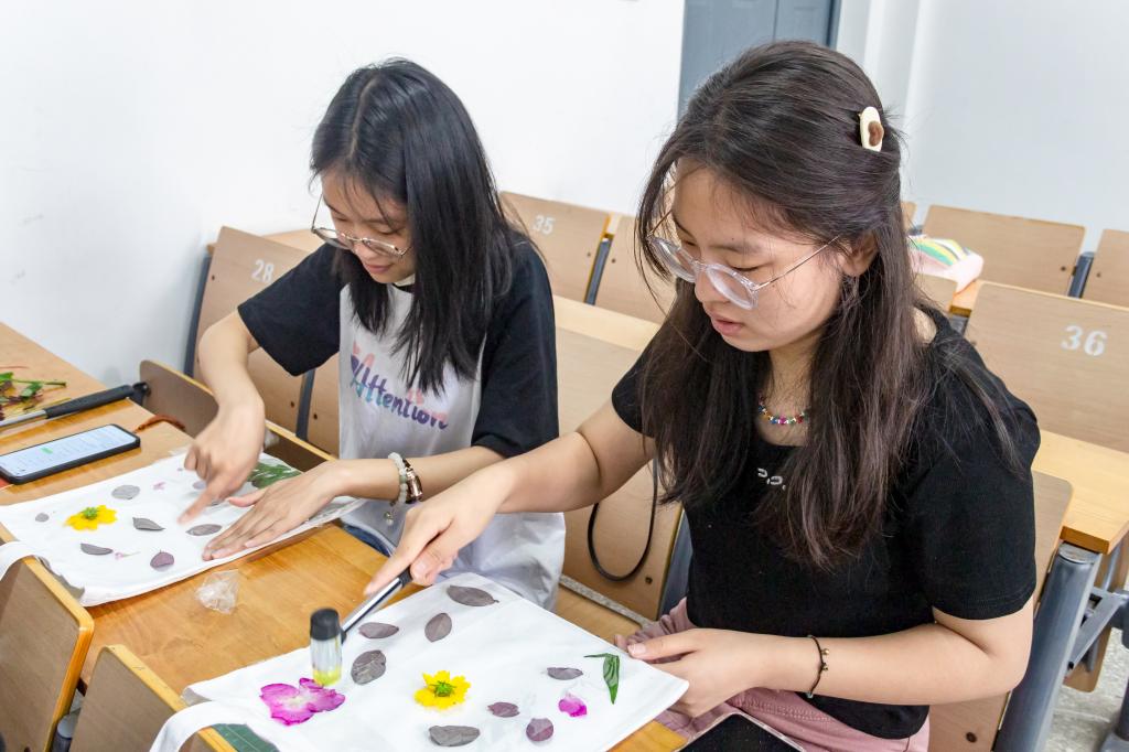 接下来,活动进入拓印布袋环节。工作人员组织同学们在纸袋上进行植物拓印并指导大家用专用的小锤进行敲打固定。植物拓印结束后同学们纷纷用毛笔、记号笔等在自己定制的帆布袋上书写或摘抄书中自己喜欢的句子。