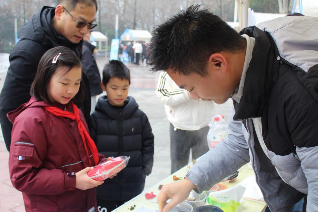 志愿者许雁博、曹禹轩从植物色素的提取原理、传统的工业染布工艺以及植物染料为何不会掉色等方面,为孩子们形象地介绍了植物染色的相关知识,以及用植物染料染色的详细步骤。袁于琪、邹桃红、楚永栋等志愿者则在摊位周边,细心地为来来往往的小朋友以及行人讲解这次活动的内容,带领大家积极动手实验。