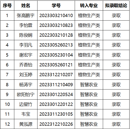 于2024年1月4日组织专家对学生的综合知识结构、思维能力、语言表达能力、个性品质等综合素质进行考核。根据考核结果及第一学年成绩GPA核算录取成绩后,拟录取张高鹏宇等12名学生进入2023级智慧农业或植物生产类专业学习,现将名单公示如下: