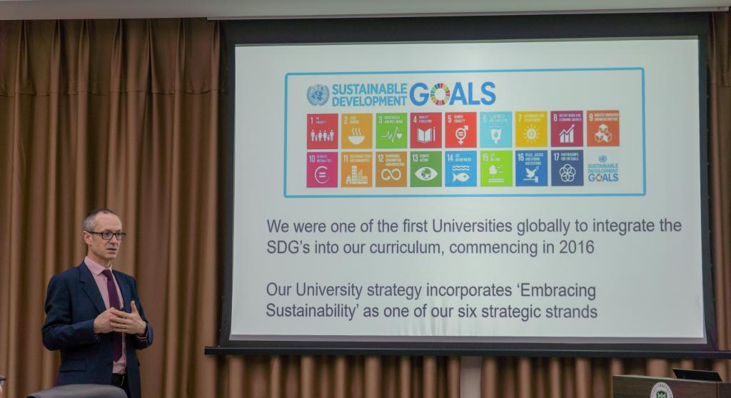 会上,Neil Mansfield简要介绍了英国诺丁汉特伦特大学的基本情况和办学特点。诺丁汉特伦特大学成立于1843年,已有180多年的办学历史,全英综合排名第12位,在过去6年里连续5年荣获全英“年度最佳大学”。学校聚焦5个研究主题,包括可持续未来研究、公民和社会安全保障研究、医疗技术和先进材料研究、科学、管理与发展研究和身心健康研究。诺丁汉特伦特大学是全球首批将“可持续发展”纳入教学课程的大学之一,在世界绿色大学排行中位列第4,始终将可持续发展作为研究目标。