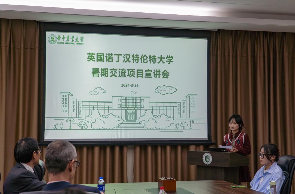 陆春贵就英国诺丁汉特伦特大学暑期交流项目展开了详细介绍。他谈到,项目课程涉及大数据分析、基因功能、智慧农业系统、未来作物探索等方面,参与项目的学生可以体验英式课堂,到学校周边地区游学,结识来自世界各地的学生,进行各式文化交流,获得进入企业交流学习的机会,帮助进行职业选择规划。项目注重提高学生的自信心和语言表达能力,同时鼓励学生探究感兴趣的课题,为学生提供自由探索的机会。
