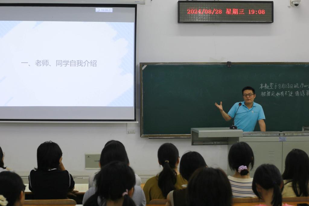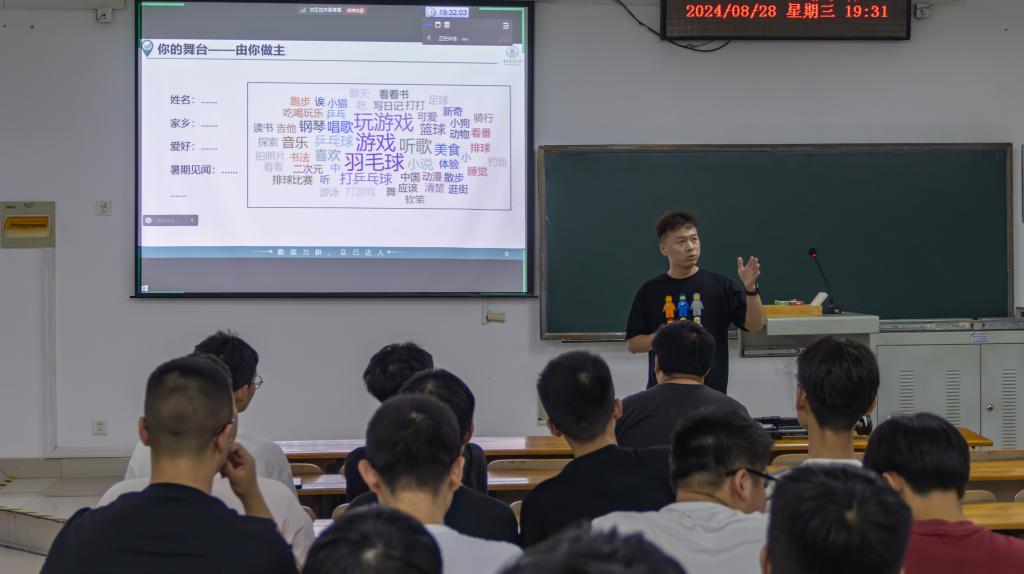 植生2407班班会上,班主任米甲明结合自身经历,就如何度过大学生活提出三条建议:一是坚持探索,找到适合自己的道路;二是明确目标,摒弃“随大流”思维;三是保持专注,在一个领域深耕下去。