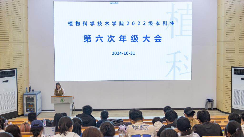 在三教S1报告厅召开2022级年级大会暨保研经验分享会。辅导员张露主持会议。