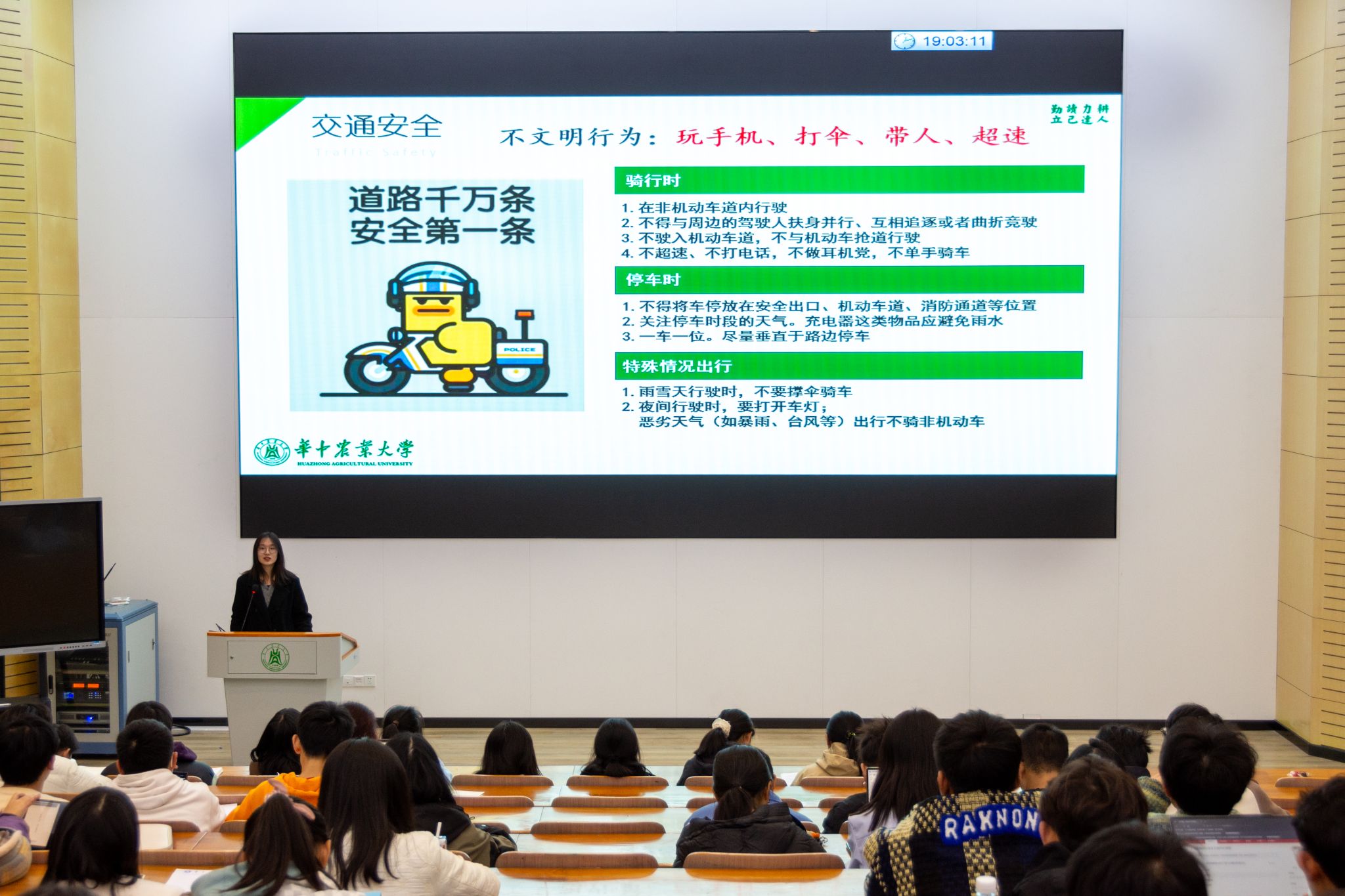 会议伊始,王艺菲结合校园案例,从消防安全、交通安全、财产安全三个主要方面深刻强调了安全对于大学生的重要性。在消防安全方面,王艺菲强调防火意识的培养和正确应对火灾的方法。在交通安全方面,王艺菲带同学们观看了校园电动自行车交通事故警示教育片,这种直观的呈现方式,让同学们切实体会到了不规范行车的危险性和交通安全的重要性。王艺菲还进一步提醒同学们要注意个人财产安全,防范电信诈骗,保护好自己的财物。