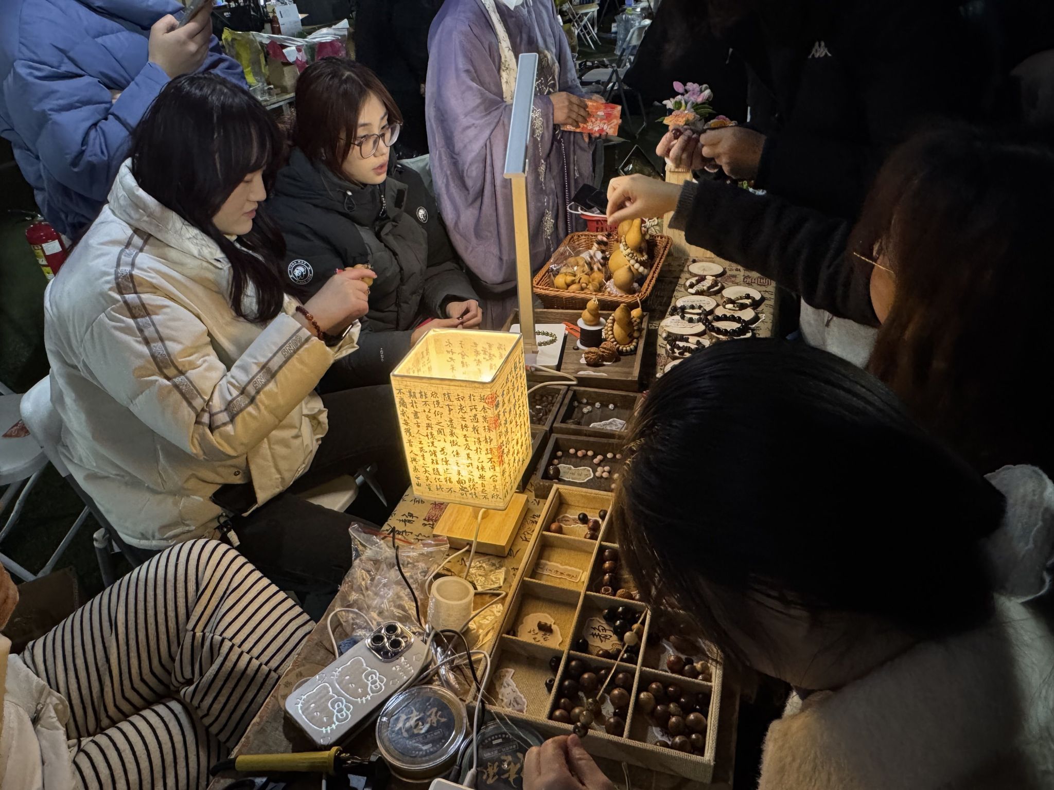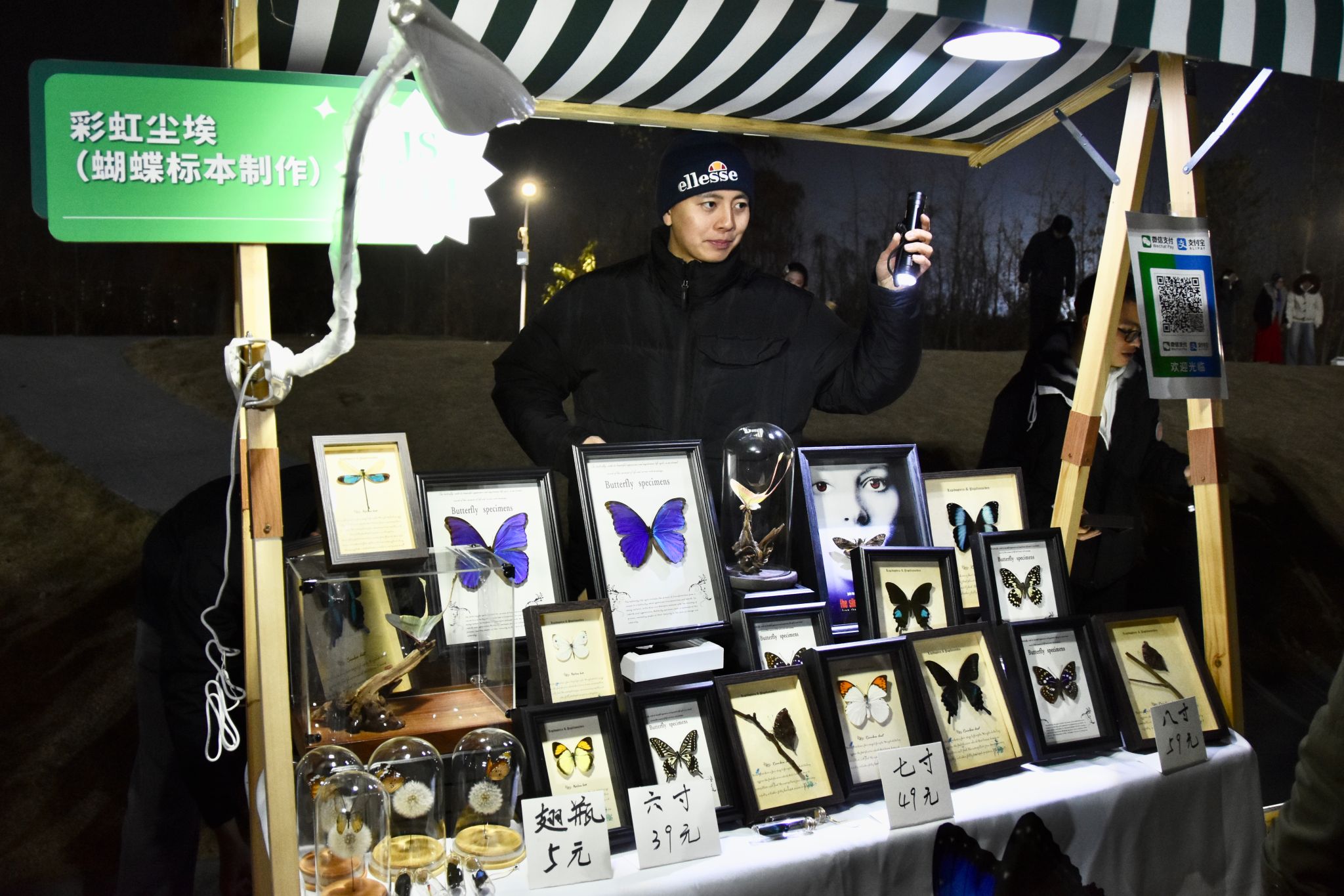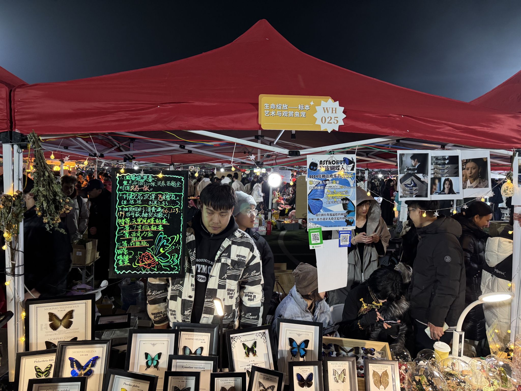 步入集市,“种情画艺” 摊位人气颇高,同学们挑选植物种子与五谷杂粮,通过粘、贴、拼、雕等手法创作精美的种子画,作品既彰显学科特色,又寓意新年五谷丰登,创意与祝福满溢。“相遇非遗・蟲语自然” 摊位同样引人注目,这里将中华传统非遗通草花与精选昆虫巧妙融合,打造出独一无二的艺术品,每一件都凝聚着匠人的心血,承载着对传统文化的敬意。