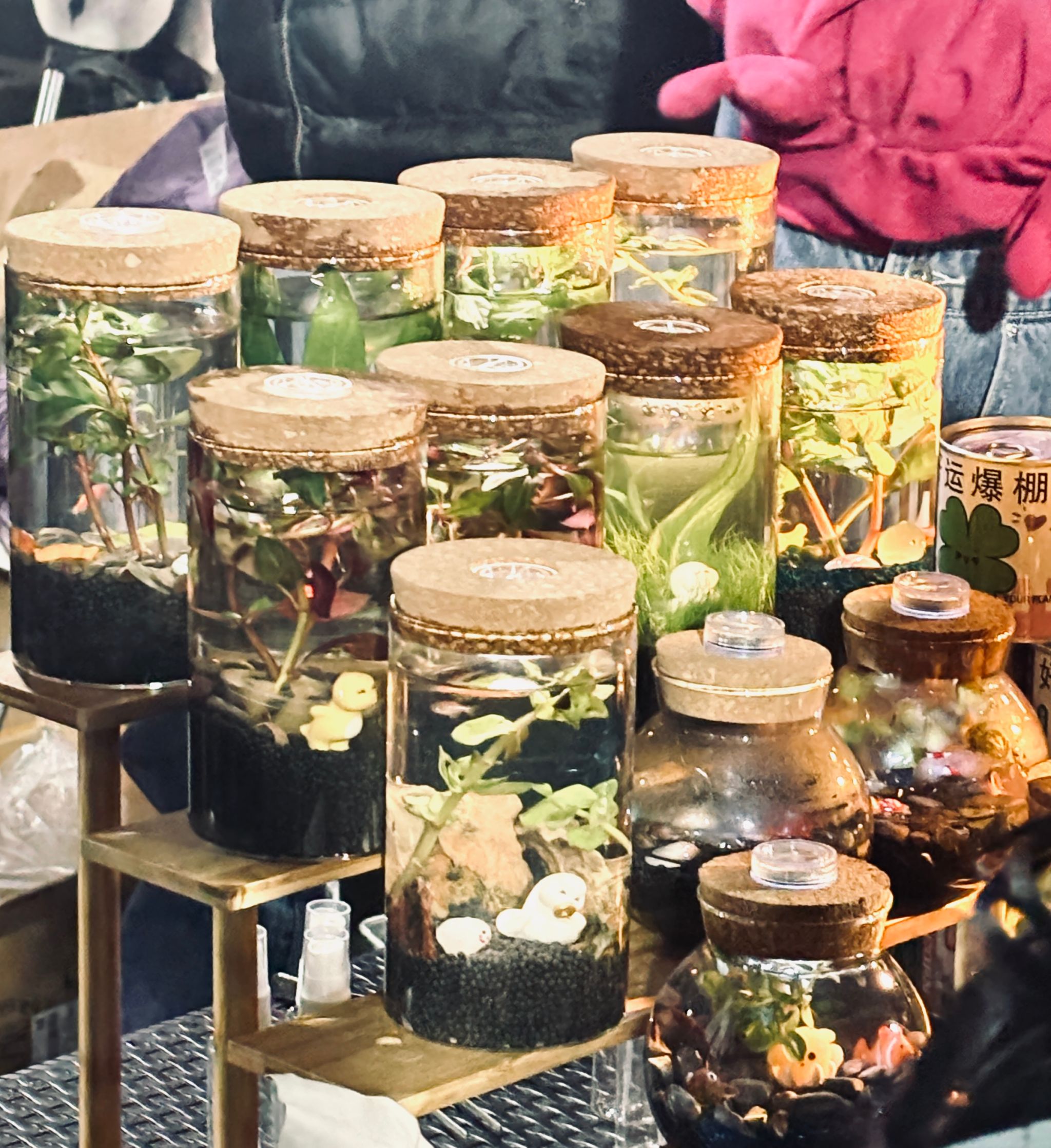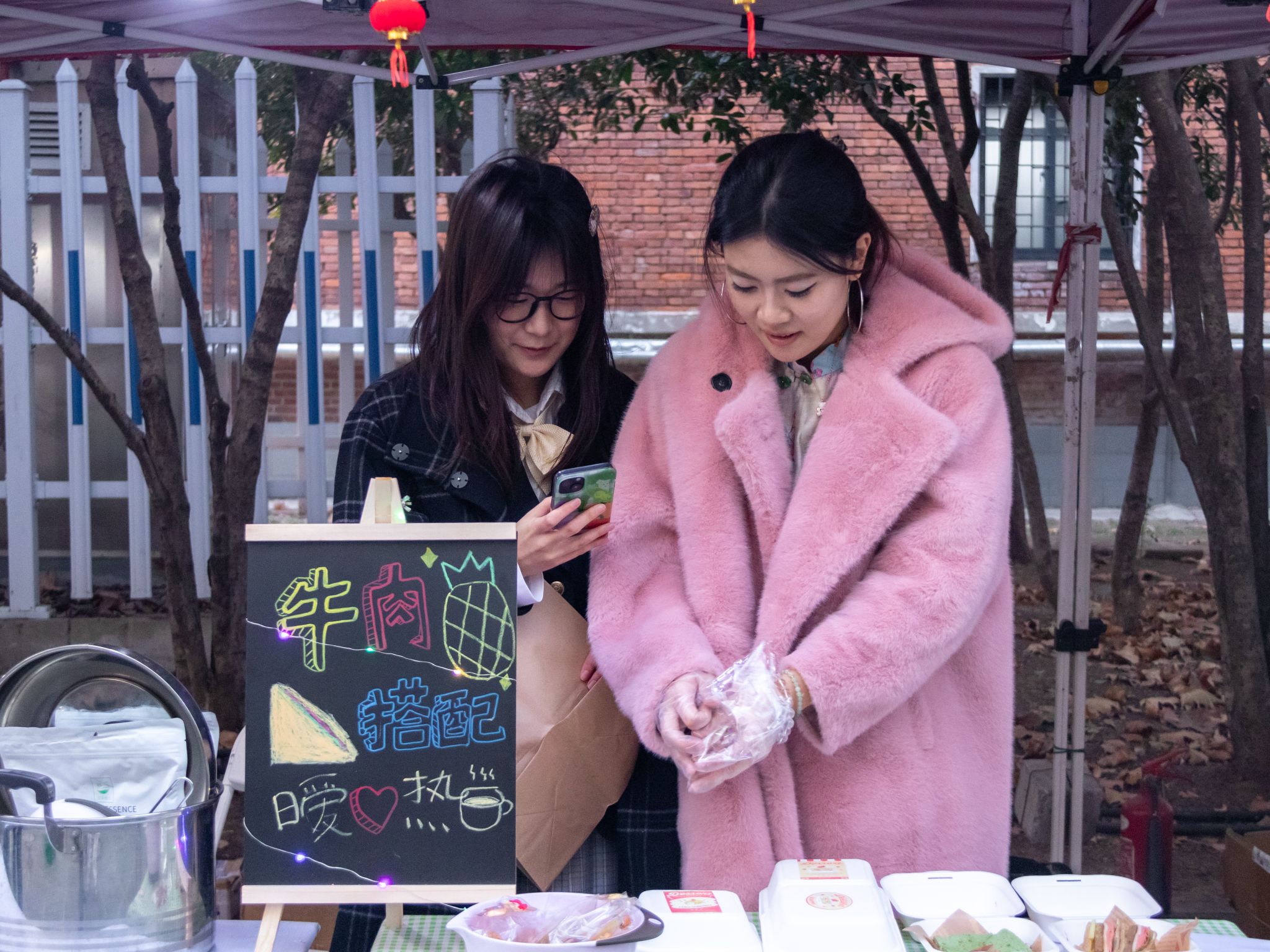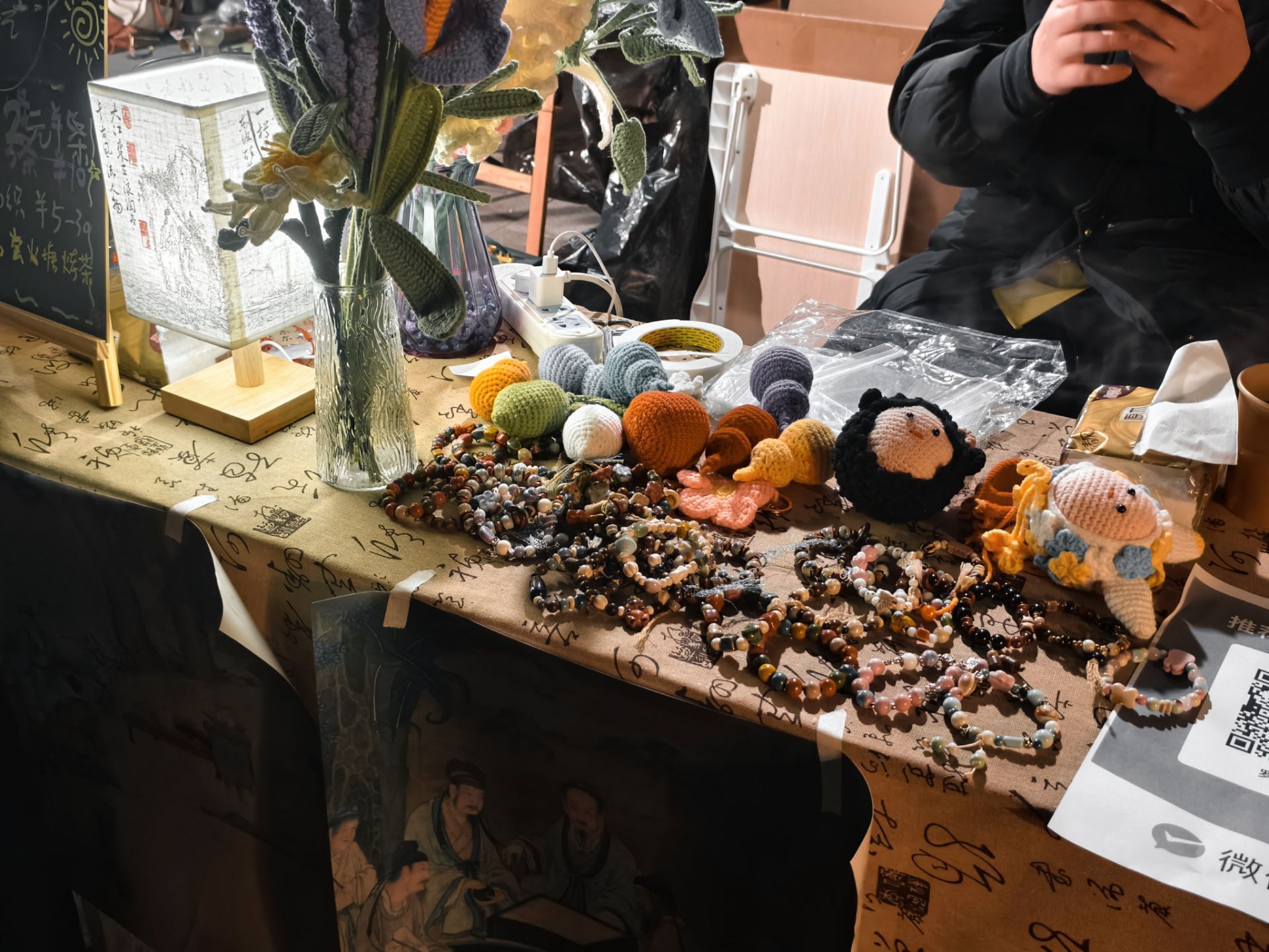 步入集市,“种情画艺” 摊位人气颇高,同学们挑选植物种子与五谷杂粮,通过粘、贴、拼、雕等手法创作精美的种子画,作品既彰显学科特色,又寓意新年五谷丰登,创意与祝福满溢。“相遇非遗・蟲语自然” 摊位同样引人注目,这里将中华传统非遗通草花与精选昆虫巧妙融合,打造出独一无二的艺术品,每一件都凝聚着匠人的心血,承载着对传统文化的敬意。