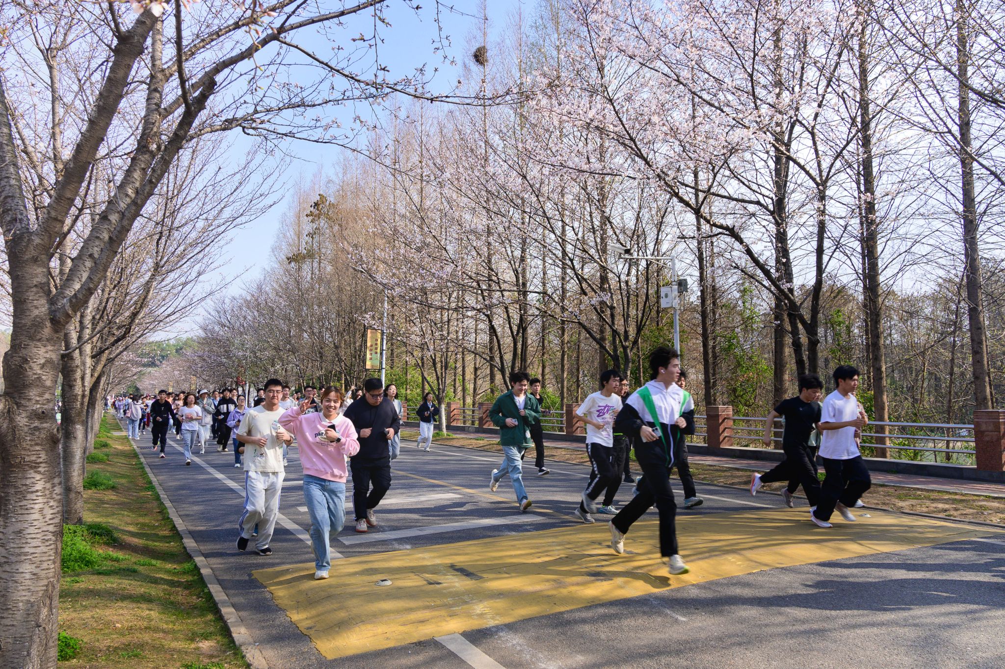 师生在奔跑中感受春日的生机与校园的美景,展现了健康向上的生活态度。