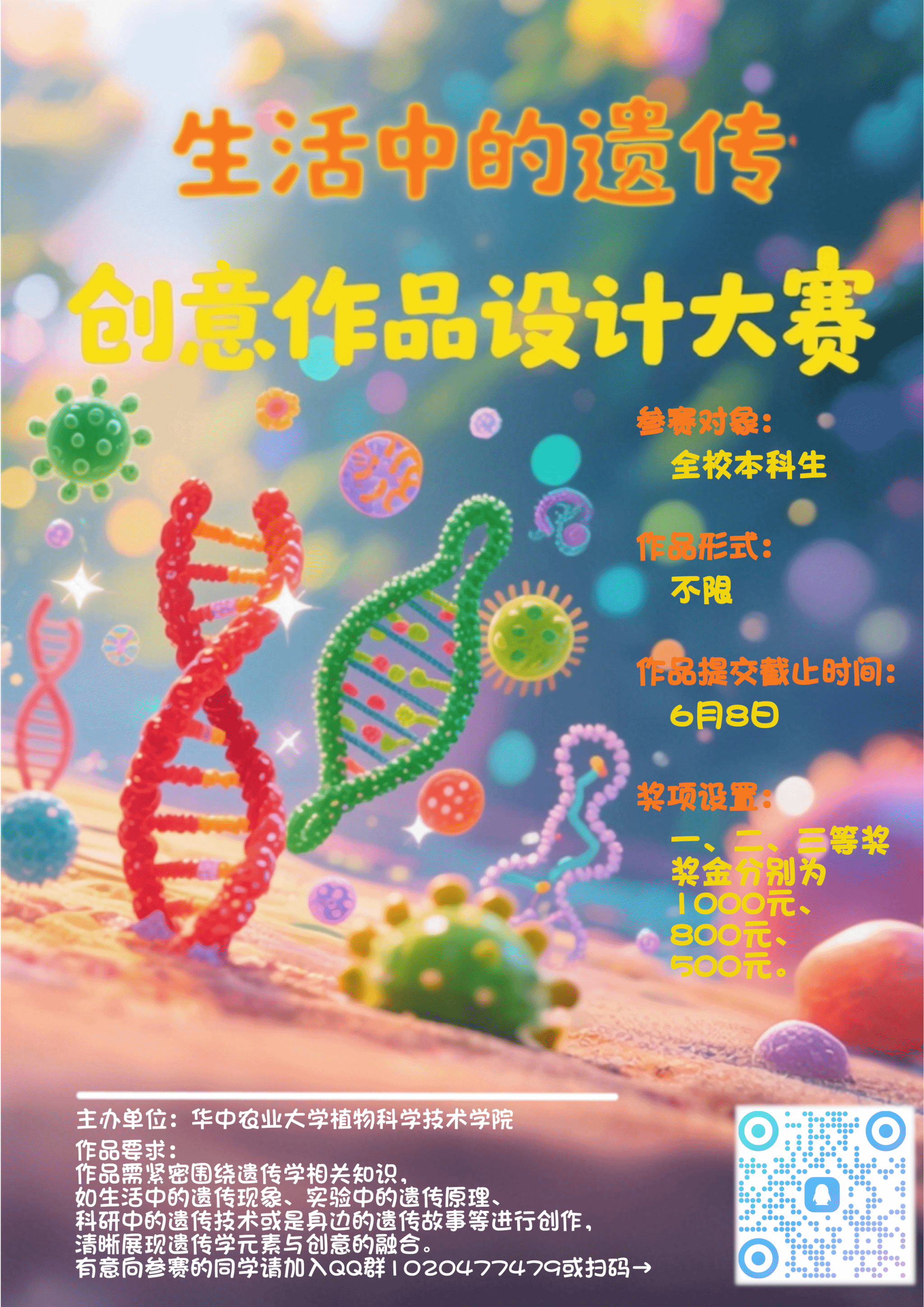 作品要求:作品需紧密围绕遗传学相关知识,如生活中的遗传现象、实验中的遗传原理、科研中的遗传技术或是身边的遗传故事等进行创作,清晰展现遗传学元素与创意的融合。