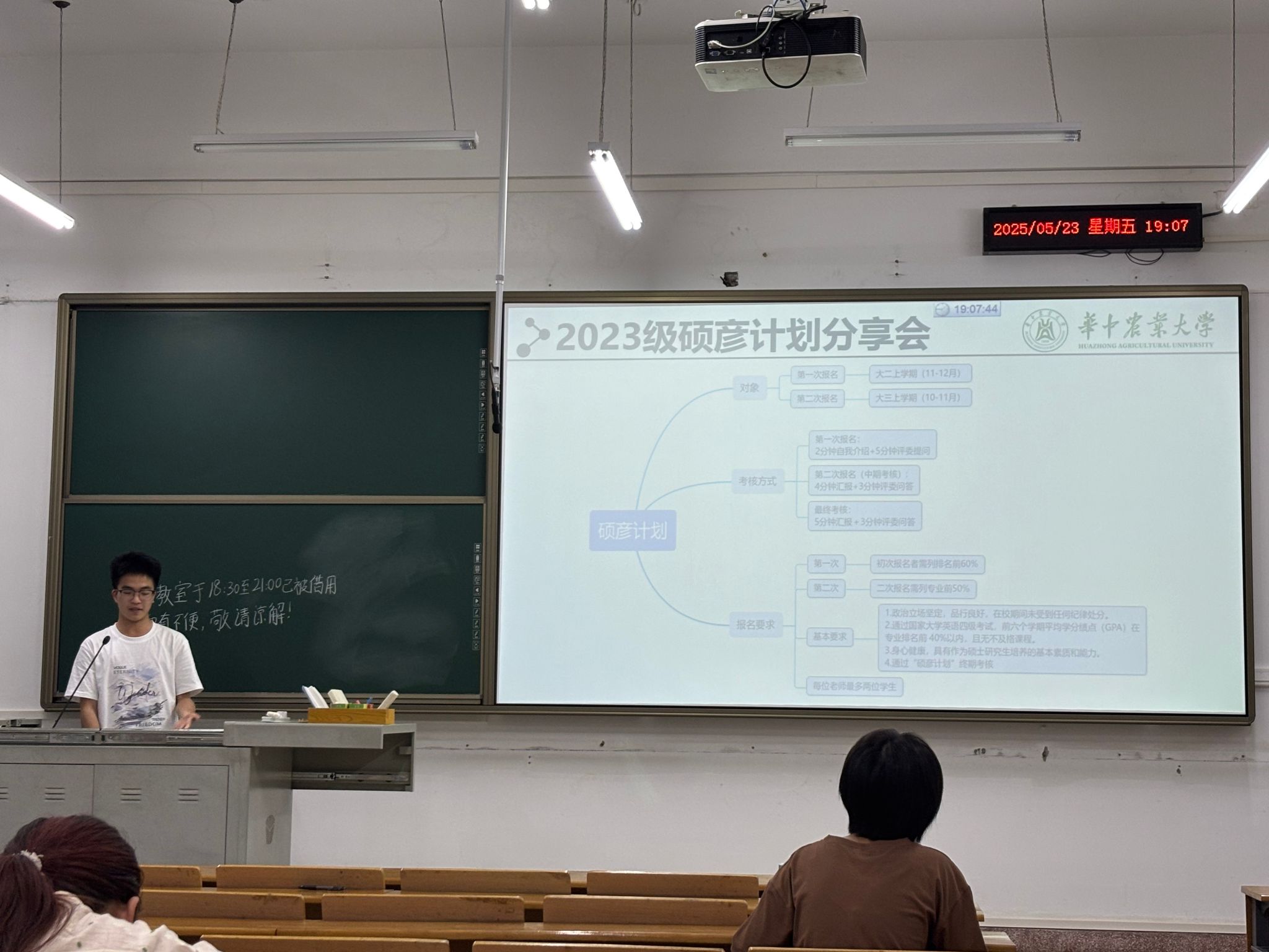 科创部于四教C108教室举办“硕彦硕果”分享会,分别邀请植保2104班黎鸿洋和智农2206班王君扬经验分享,七十余名同学现场参与。
