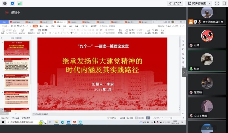 本期训练营中,9位兼职辅导员(助管)逐一进行汇报。李钰从党员档案审查、党员发展以及党组织关系转接三个方面分享了党建专项工作。他认为,党员档案要做到问题梳理到位、工作规范到位,党员发展要做到严要求、高质量,党员党组织关系转接要做到“一查”“二讲”“三问”要求,切实弄清党员信息,核实党员身份,掌握党员去向。李安就光明日报发布的《继承发扬伟大建党精神的时代内涵及其实践路径》这篇理论文章展开了研读分享,他提到:“人无精神则不立,国无精神则不强。”伟大建党精神穿越时空,历久弥新,是我们最宝贵的精神财富。我们要赓续红色血脉,弘扬伟大建党精神,让伟大建党精神在新征程上焕发新的光芒。