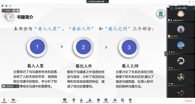 生态文明建设是关乎中华民族永续发展的根本大计,叶婷以“建设生态文明 共筑绿色家园”为题进行时政博文的写作,让大家了解到位于新时代新阶段的中国,应该把把生态环境保护摆在更加突出的位置,把为民、靠民、惠民落实到生态文明建设实践中,才能更好满足人民对美好生活的向往。针对高校毕业生的就业现状,赵雪婷通过网络调查指出了农学类硕士毕业生就业择业存在的问题以及发展方向。并对作为研究生如何在严峻的就业市场下找到属于自己的位置提出了建议。张思裕同学就“做你自己就好”为题展开演讲,她认为你我都是独一无二的自己,是世间万物不可复制的生命,不必羡慕他人优点,也不用纠结自己缺点,做自己就是最好的。白睿哲给大家分享了美国作家罗纳德·阿德勒的作品《沟通的艺术》,他从“看入人里”、“看出人外” 和“看人之间”三个部分分别进行了书籍简介,探讨了与沟通者有关的因素、沟通者之外信息的传送与接收以及关系的演变过程,强调了良好的心态、发自内心的感情以及主动的倾听对于沟通的重要性。