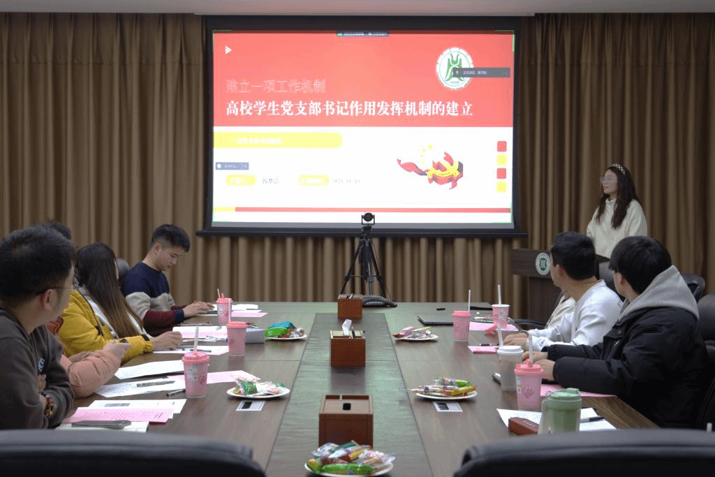 另一方面,韩梦洁从党支部书记视角为大家分享了学生党支部书记应如何发挥作用,通过导向机制、目标机制、动力机制和协作机制四个方面介绍如何引导和规范学生党支部书记的工作,加强宣传教育,互联互动,通过交流学习,提升工作能力,形成良好的党建宣传教育氛围。