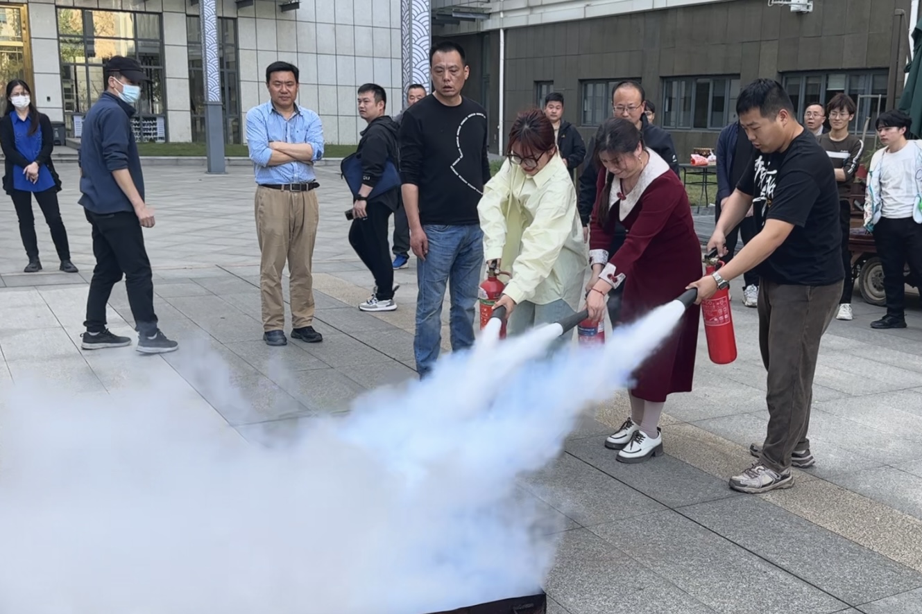 建安部工作人员指导现场师生学习灭火器的操作使用。讲述了灭火器使用的“提、拔、瞄、压”四字口诀。使用前要先将灭火器提起,观察压力表的指针是否指向绿色区域,拔下灭火器的保险销,瞄准握住喷管前端,右手提起灭火器提把,在距离火源 3-4 米的上风向位置,瞄准火源根部,用力压下手柄进行灭火。