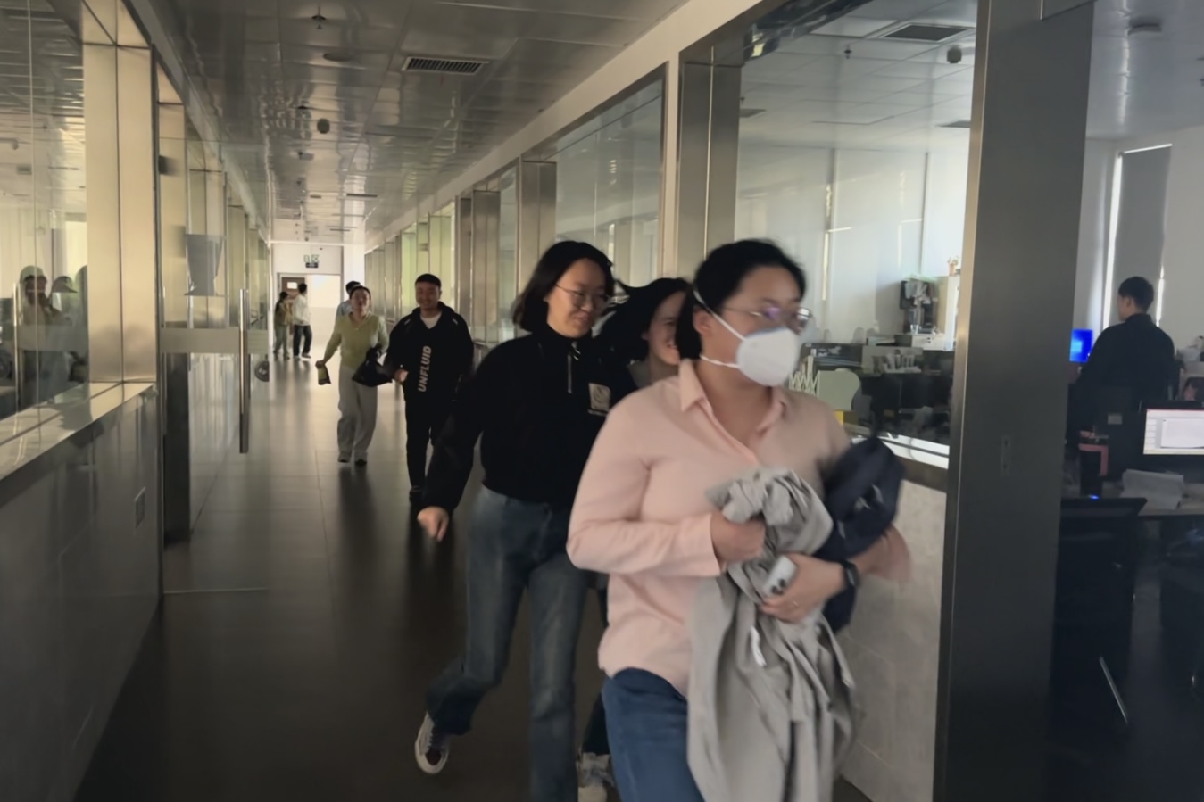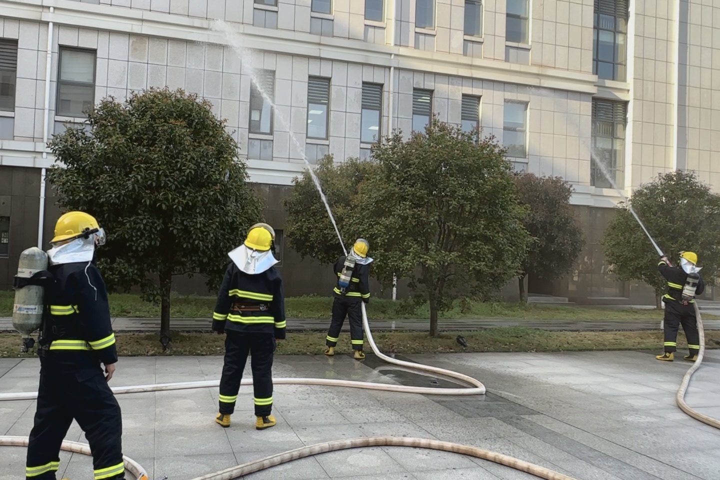 预设地点起火后,烟雾弥漫,迅速触发消防报警系统,警铃响起,通知全体师生迅速撤离。在工作人员的引导下,楼内师生沉着冷静、互帮互助,迅速有序地按照疏散路线撤离到指定的安全区域。与此同时消防车也已达到起火现场,迅速展开救援行动。