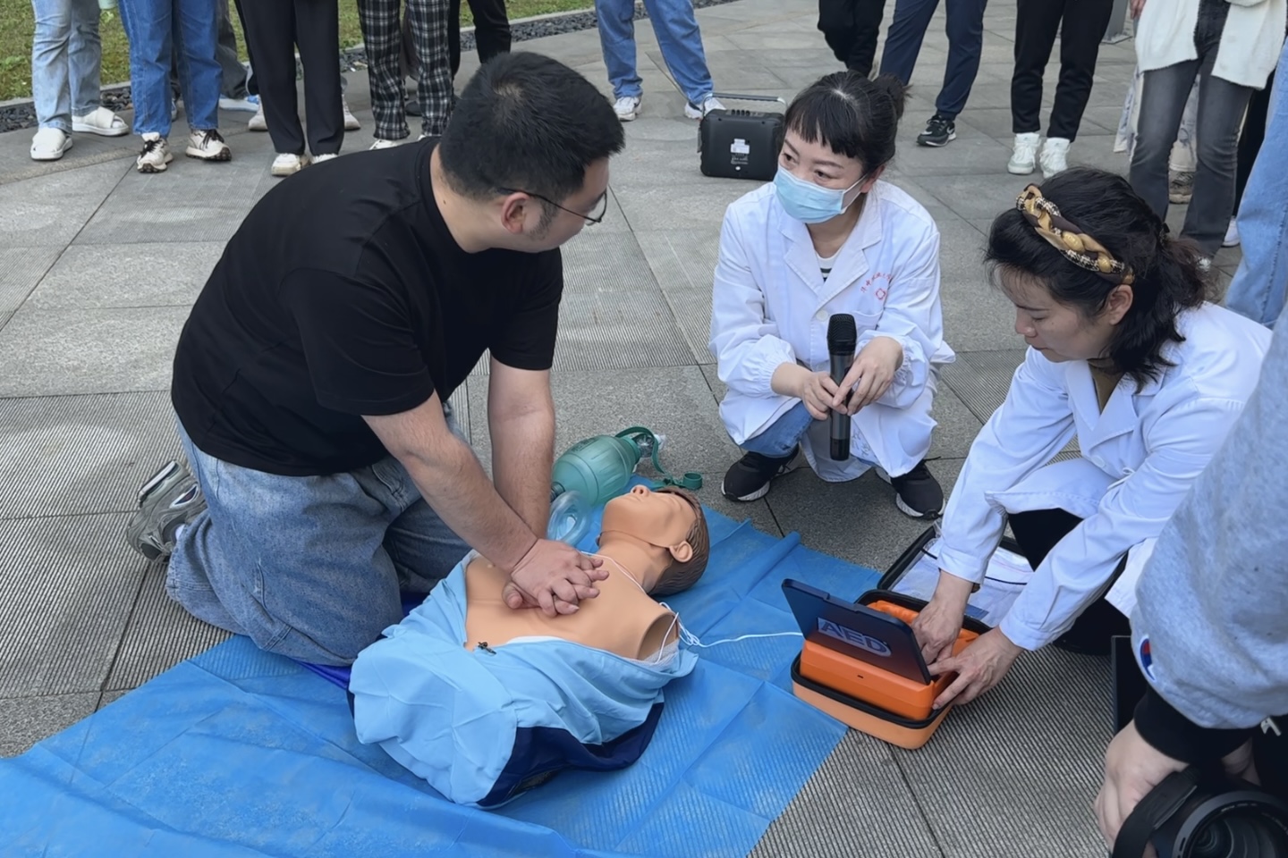 随后校医院工作人员为师生进行了 CPR(心肺复苏)与 AED(自动体外除颤仪)培训。医生讲解到:“在心源性猝死的黄金四分钟内,及时进行 CPR 与使用AED,可极大提高心脏骤停患者存活率。国内许多大型公共场所已经配有语音教学、一键识别、一键启动的 AED。校内运动场通道墙面、校医院等地均有部署和标志”。