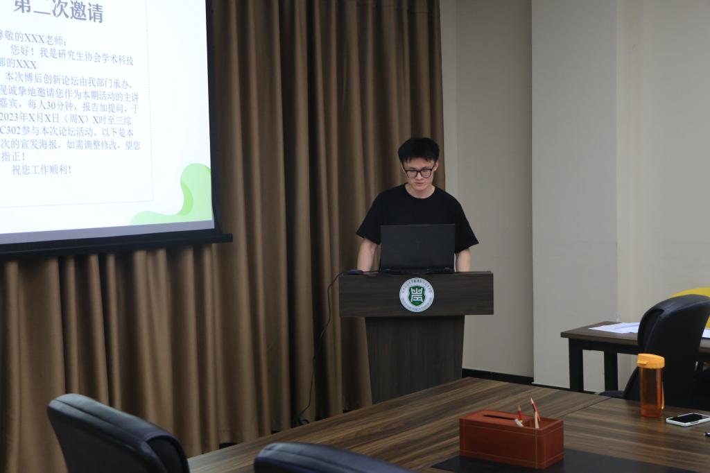 学生学术考评的重要指标之一。他从活动前期的宣发工作、博后对接工作,到活动中期的设备准备及调试、主持、拍摄工作,再到活动后期的对接新闻部人员、写总结层层递进,最后还分享了注意点和心得,为我们清晰地展示了博后论坛工作的要点。