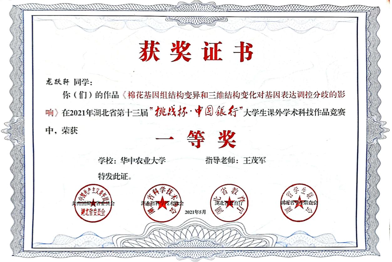 第十三届“神农杯”大学生课外学术科技作品竞赛特等奖和湖北省 “挑战杯”大学生课外学术作品竞赛一等奖的成绩(图2),目前已入围国赛且正在备战。