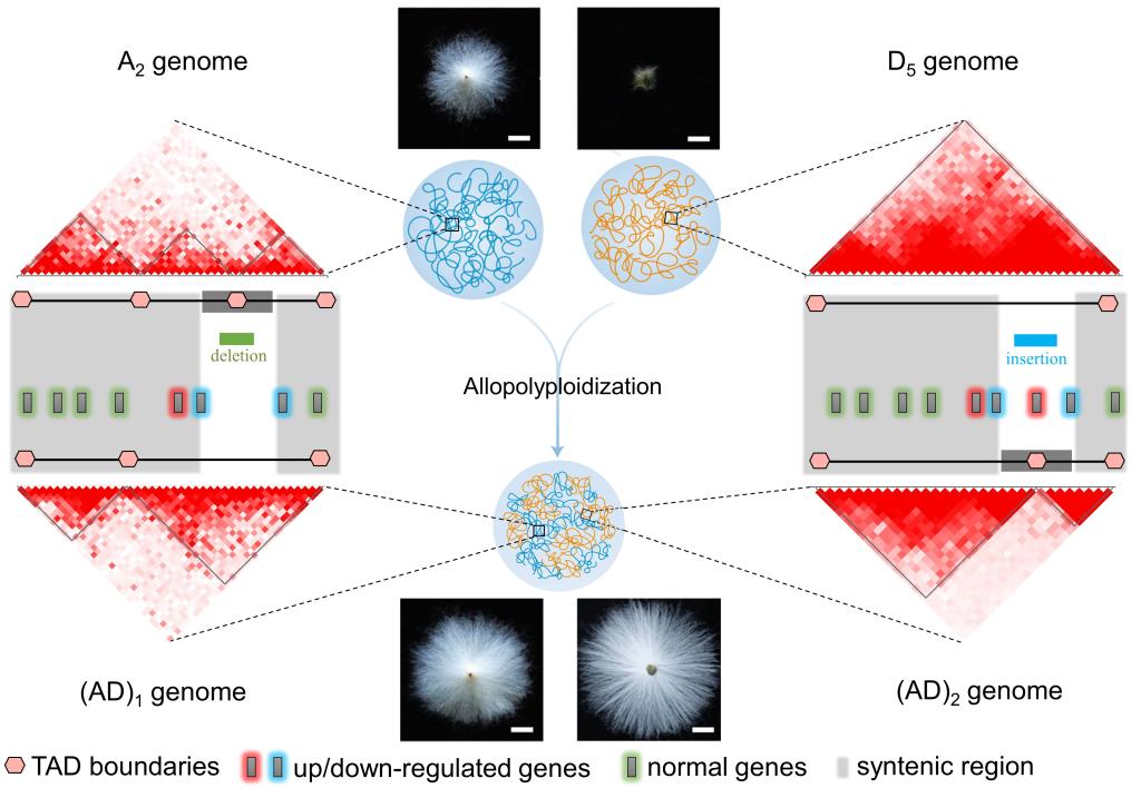 进一步的研究发现,结构变异更倾向于发生在TAD内部,这可能是由于在进化过程中TAD边界区域相较于TAD内部具有更大的选择压力。此外,研究还发现在四倍体中,A、D亚基因组发生了分歧进化。最后结合RNA-seq数据,研究发现了结构变异和TAD结构的改变均会导致同源基因的差异表达。基于这些结果,提出了四倍体棉花进化过程中结构变异对于染色质三维结构的重塑模型(图1)。