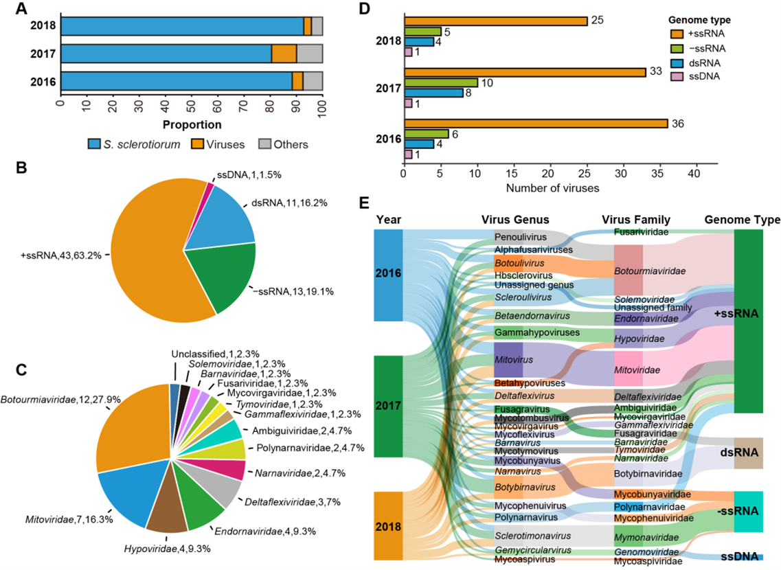 真菌病毒是病毒界重要的组成,在真菌中普遍存在,且低毒相关真菌病毒有防控真菌病害的应用潜力。研究团队长期致力于真菌病毒及其应用研究,为明确病毒自然状态存活机制,解决真菌病毒田间生防应用稳定性的难题,研究团队连续三年对分离自同一田块的核盘菌群体(100个菌株/年)中病毒的多样性及动态变化进行了系统性研究。基于宏病毒组分析共发现了68种不同的真菌病毒,病毒的相对丰度和种类在年际间有差异性,但也存在稳定的核心病毒组(图1)。该研究首次从群体水平上阐明了真菌病毒多样性的年度变化,为真菌病毒的田间实践应用提供了理论支撑(Jichun Jia et al., 2021,Virus Evolution)。