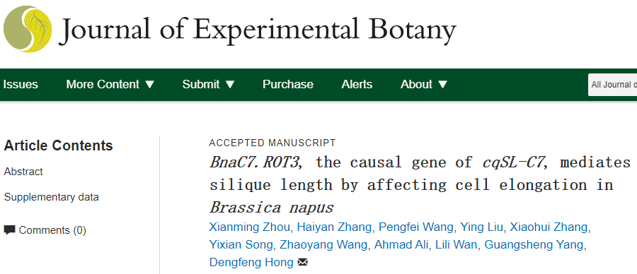 2021年9月6日,Journal of Experimental Botany在线发表了油菜团队题为“BnaC7.ROT3, the causal gene of cqSL-C7, mediates silique length by affecting cell elongation in Brassica napus”的研究论文。该研究发现油菜BnaC7.ROT3通过促进角果皮细胞伸长来调控角果长度,其第五个外显子中的单核苷酸缺失是亲本之间发生表型变异的原因。