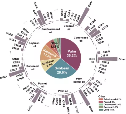 图1. 2020年全球植物油消费量和主要植物油的脂肪酸组成