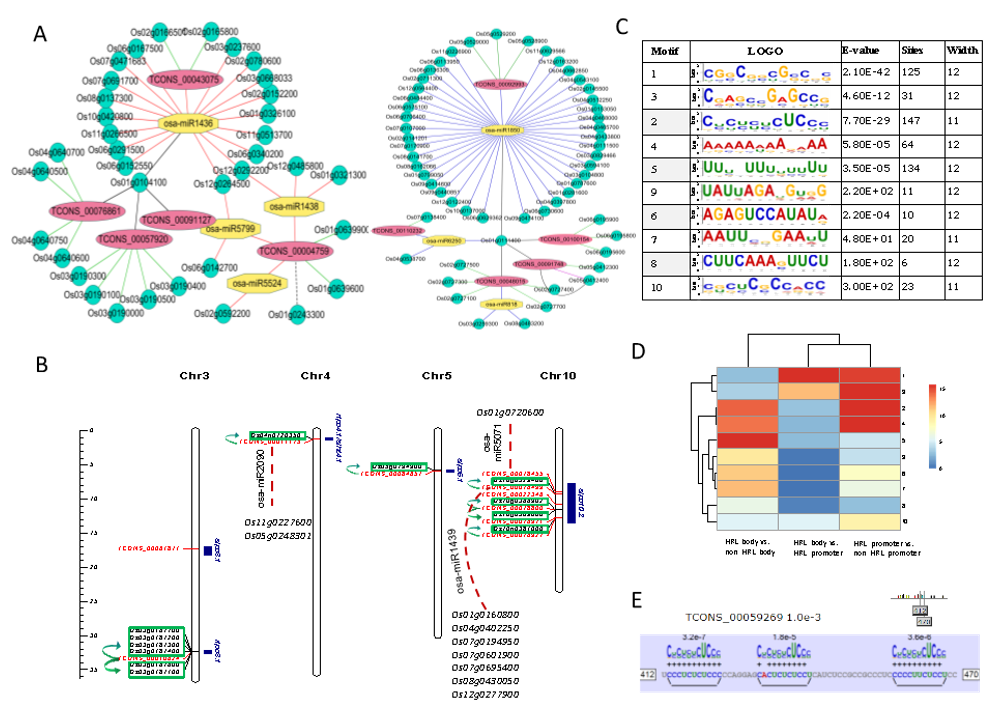 长链非编码RNA在植物发育及对环境胁迫的响应中起着至关重要的作用,系统识别和理解lncRNAs介导的基因互作网络是解析和改良农作物复杂性状的理论基础。本研究对高温耐受性不同的水稻品种进行了链特异性RNA测序,鉴定了2743个lncRNAs,构建了其在热处理后的综合表达图谱;基于lncRNA与靶基因的互作模式(顺式作用、内源竞争生RNA、miRNA前体和反义RNA等),构建了热胁迫响应lncRNA(Heat Responsive LncRNAs, HRLs)与mRNA、小RNA的互作网络;对HRLs进行了功能注释;HRLs及靶基因与热胁迫下水稻幼苗生长相关遗传位点的整合分析为不同RNA分子在热胁迫响应中的互作功能提供了进一步证据;热胁迫相关lncRNA序列模体的显著富集为后期利用基因编辑等手段研究HRLs的功能提供了重要候选靶点。该研究为进一步阐释lncRNAs调控植物热胁迫应答的功能和植物耐热性遗传改良提供了宝贵的资源和理论基础。