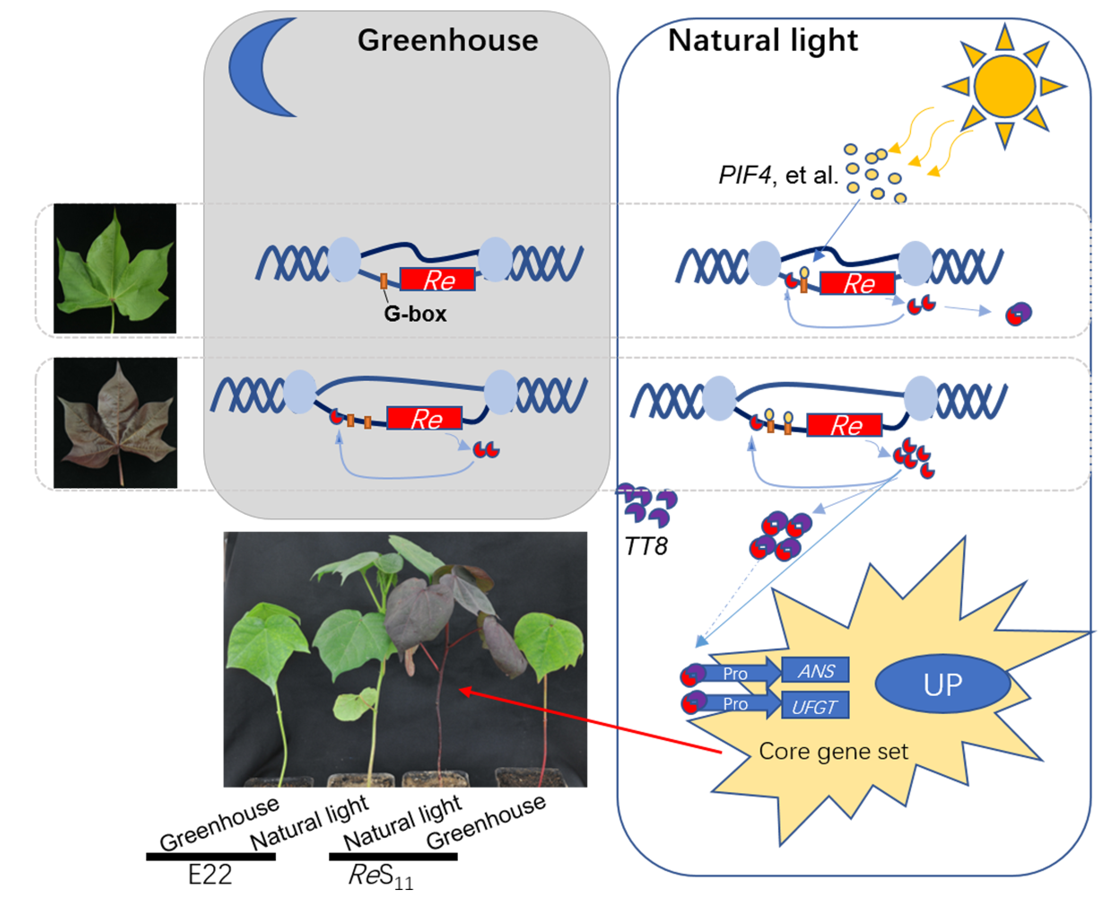 套袋实验证明突变体中Re的表达受自然光的诱导。利用突变体、35S启动子超表达系以及纤维特异表达系在自然光和温室两种条件下的转录组数据,研究团队构建了陆地棉中参与色素代谢的核心基因集,并初步构建了Re参与的色素代谢网路。PIF4可能是Re响应自然光的因子,Re可以直接调节类黄酮代谢路径下游ANS和UFGT的表达,从而影响PA与花青素的积累。