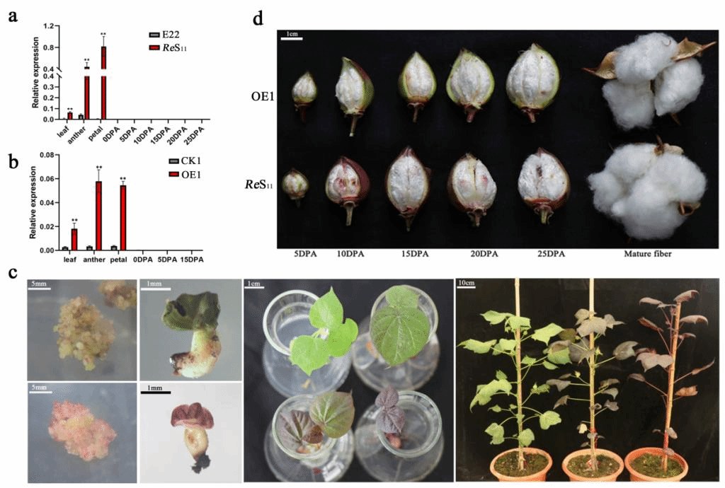 棉花遗传改良团队题为“Re enhances anthocyanin and proanthocyanidin accumulation to produce red foliated cotton and brown fiber”的研究论文,该研究解析了一个海岛棉和陆地棉种间杂交获得的红色植株突变体的遗传机制,并利用纤维特异启动子将该基因在纤维中特异表达,获得了棕色纤维的棉花。该研究赋能一个普通基因,使其发挥“特殊”功能,开辟了一个创造彩色棉花的新途径。