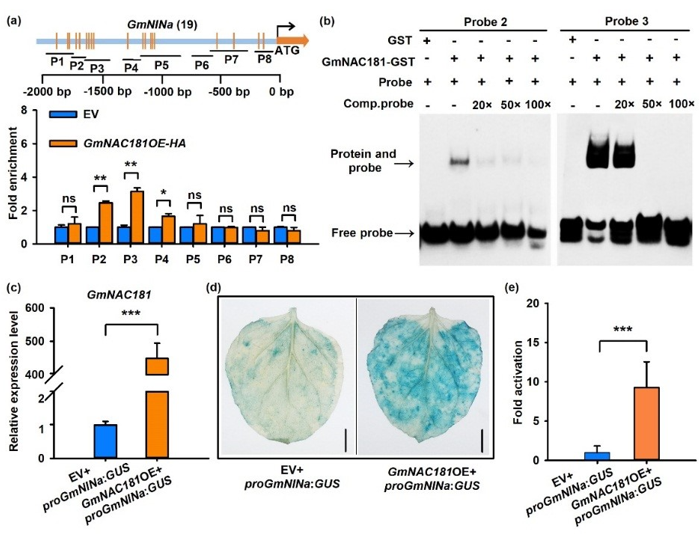 图2. GmNAC181直接结合结瘤因子信号通路的重要基因GmNINa启动子并激活该基因表达