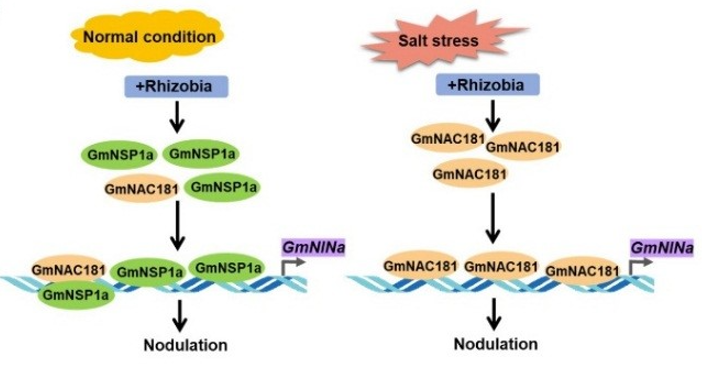 (通讯员:王小迪)近日,大豆团队在New Phytologist上在线发表题为“GmNAC181 promotes symbiotic nodulation and salt tolerance of nodulation by directly regulating GmNINa expression in soybean”的研究论文。该研究不仅揭示了NAC转录因子GmNAC181通过激活GmNINa和结瘤信号通路促进大豆结瘤的关键分子机制,更揭示了GmNAC181作为分子网络节点协调盐胁迫下共生结瘤的可塑性发育新机制。