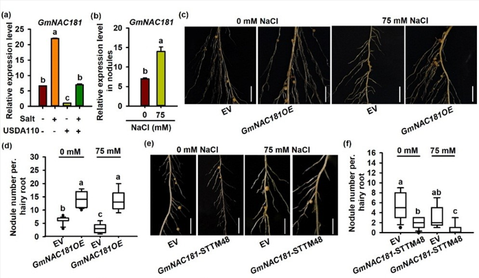 图1. GmNAC181正向促进大豆在盐胁迫下的结瘤效率