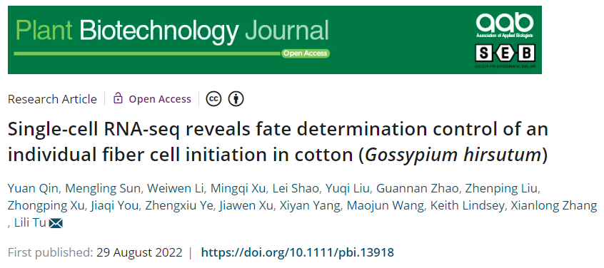 2. Qin Yuan, Sun M, Li W, Xu M, Shao L, Liu Y, Zhao G, Liu Z, Xu Z, You J, Ye Z, Xu J, Yang X, Wang M, Lindsey K, Zhang X, Tu L. Single-cell RNA-seq reveals fate determination control of an individual fiber cell initiation in cotton (Gossypium hirsutum). Plant Biotechnol J. 2022; //onlinelibrary.wiley.com/doi/10.1111/pbi.13918