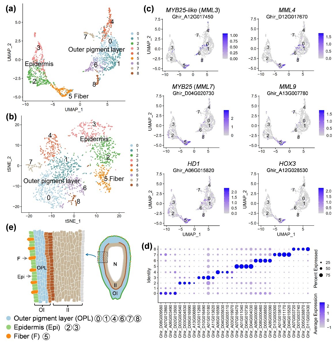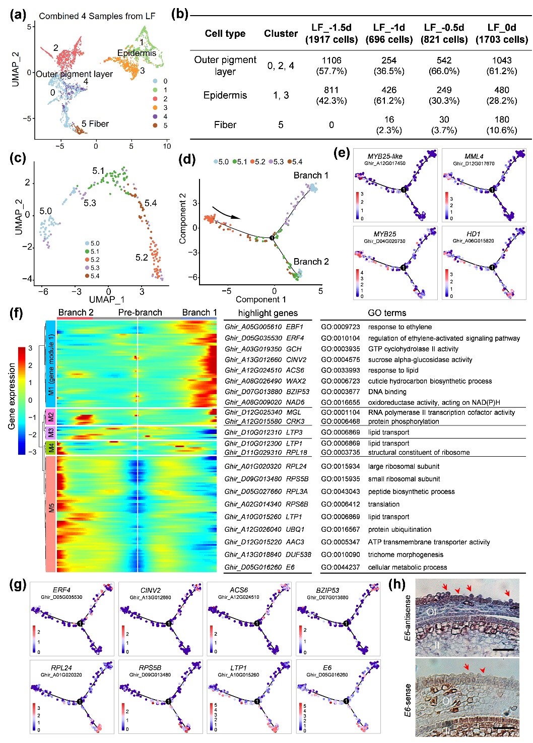 本团队前期为了简化纤维突变体的遗传背景,以陆地棉Xu142及其光子突变体Xu142 fl为亲本进行杂交,得到了3份遗传背景高度相似的纤维突变体姊妹系(Hu et al, 2018, Plant Biotechnol J)。利用单细胞转录组测序(single-cell RNA sequencing, scRNA-seq),从具有野生型表型的Xu142_LF纤维起始4个阶段(开花前1.5、1、0.5天和开花当天)的胚珠外珠被中共鉴定出14,535个细胞。基于纤维marker基因表达模式分析和RNA原位杂交结果,将这些细胞定义为3个主要的细胞类型,即纤维细胞、非纤维表皮细胞和外色素层细胞。对Xu142和突变体Xu142 fl胚珠的scRNA-seq数据进行比较分析,进一步定义了纤维细胞类型(图1)。