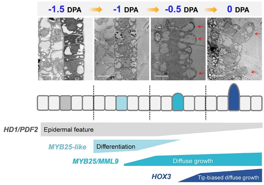 纤维细胞的发育轨迹分析显示,纤维起始可以细分为几个连续但特征明显的过程。胚珠表皮细胞在-1.5 DPA(开花前一天半)时有部分细胞处于前体纤维细胞状态,前体纤维细胞在-1 DPA时分化为纤维细胞,随后开始扩散生长(diffuse growth),在-0.5 DPA时开始突起,然后0 DPA时从转录水平上开始向极性生长(tip-biased diffuse growth)转变(图2)。