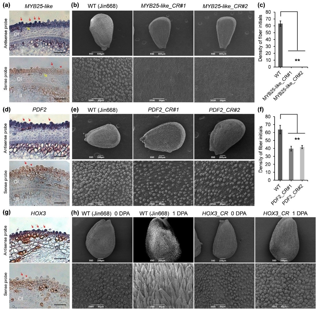 本研究分别对四个样本(-1.5、-1、-0.5、0 DPA)进行了权重基因共表达网络分析(WGCNA)。按转录因子对网络中的基因进行过滤,分别得到四个阶段参与纤维起始的转录因子调控网络,从而揭示了这些过程中分别发挥作用的核心转录因子的时空表达模式。其中MYB25-like 在-1 DPA开始高表达,CRISPR转基因实验证明该基因决定纤维分化;HOX3 在0 DPA开始高表达,转基因实验证明该基因并不影响纤维分化与突起,但决定纤维细胞能否极性生长。此外,对表皮特异因子PDF2的CRISPR验证表明其功能缺失导致0 DPA胚珠表皮突起细胞数量显著减少(图3)。