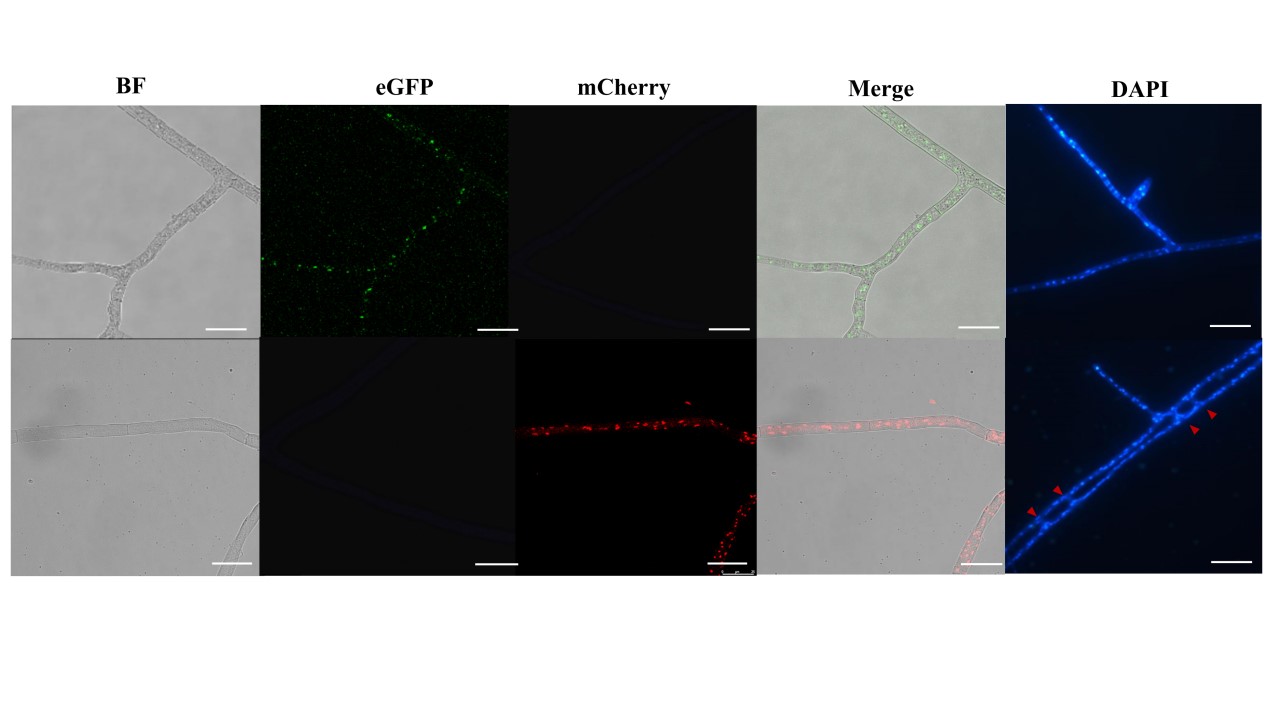 近期,应用真菌团队构建了两种细胞核荧光标记的重组载体,采用农杆菌介导的遗传转化方法,对梯棱羊肚菌两种交配型单孢菌株的细胞核进行荧光标记。结果显示绿色荧光蛋白eGFP和红色荧光蛋白mCherry均能在梯棱羊肚菌菌丝中稳定表达。将两种不同荧光蛋白标记的菌丝进行配对培养,观察到菌丝细胞融合形成异核体的现象。本研究为羊肚菌基础生物学及遗传学研究提供了关键技术方法,对开展羊肚菌基因功能研究和杂交育种具有重要意义。