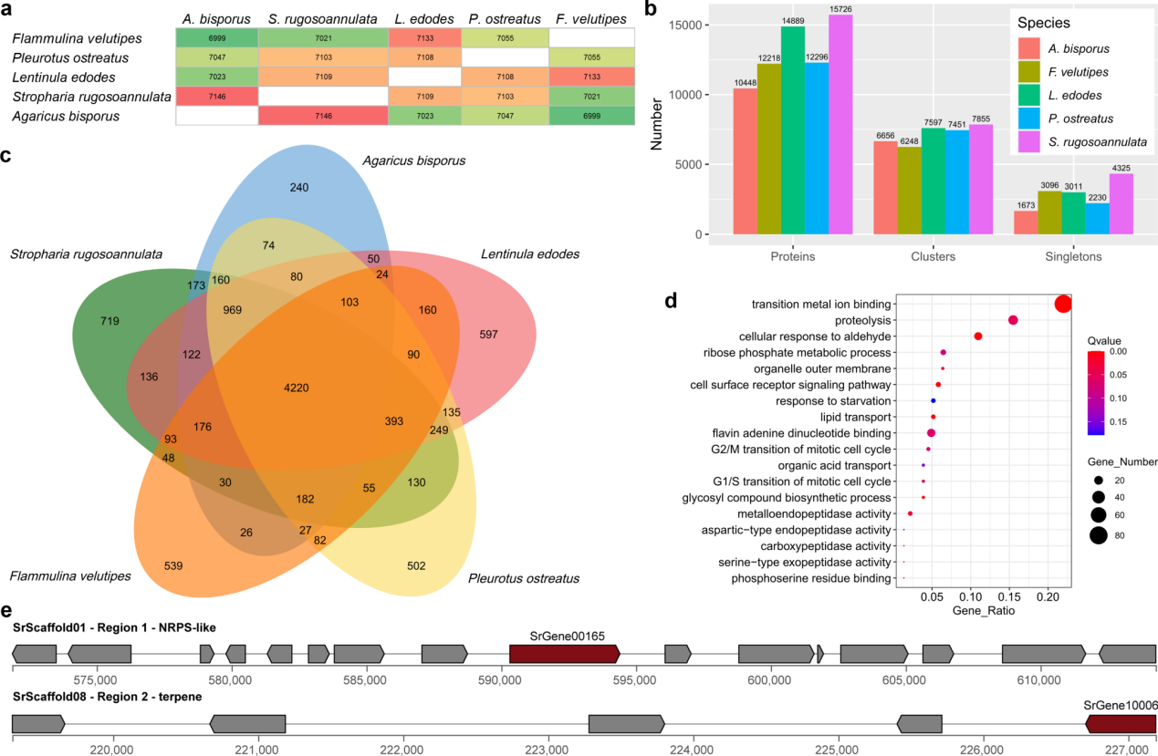 图3 大球盖菇基因组和其它四种主栽食用菌的比较基因组分析