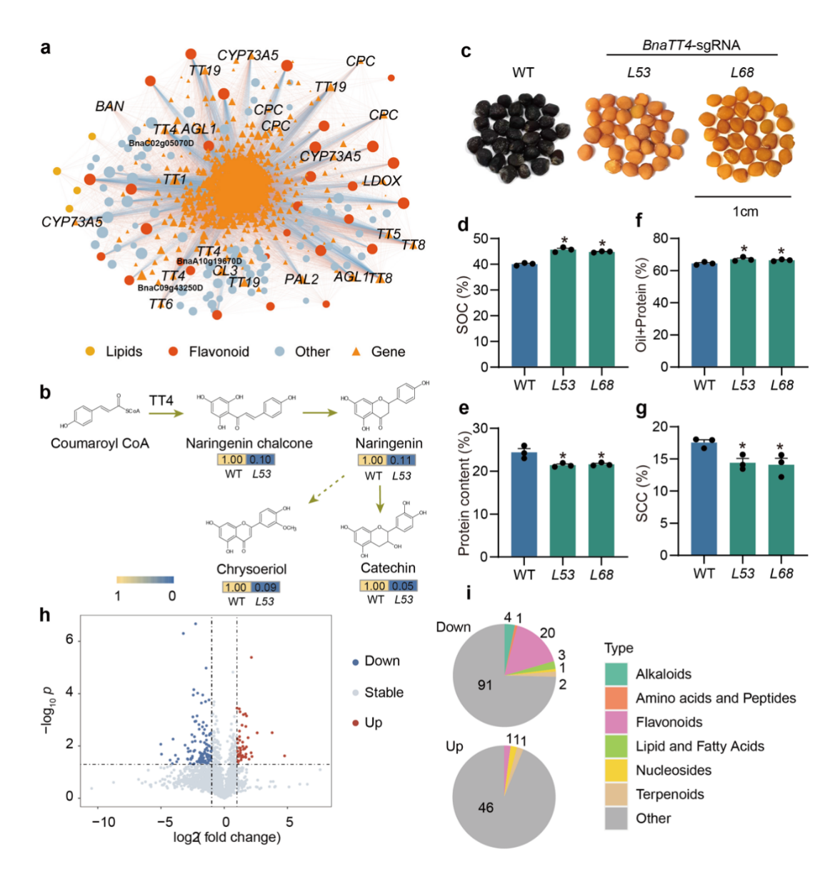 BnaTT4编码查尔酮合成酶,该酶催化黄酮生物合成的第一步反应。该研究结合mGWAS和共表达网络分析,发现黄酮生物合成途径中的基因BnaTT4可能影响油菜种子的含油量(图2)。进一步通过基因编辑技术创建BnaTT4基因的突变体材料,与野生型相比,BnaTT4突变体种子中黄酮类物质含量显著下降。BnaTT4突变体L53和L68的种子含油量分别为45.7%和44.8%,显著高于野生型油菜种子含油量(40%)。