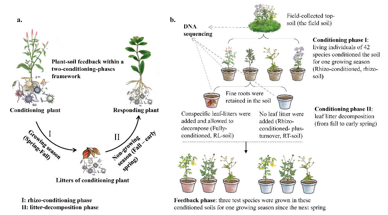 土壤微生物如何通过植物-土壤反馈(PSFs)作用调控种间相互作用、促进物种共存或入侵是当下生态学研究的一个热点问题。理论上,植物可以通过根际分泌物(生长季)和凋落物分解(非生长季)依次调节土壤生物群落(例如真菌和细菌群落),从而影响后期生长于同一土壤的植物。然而现有研究多数采用两阶段实验(土壤驯化和反馈两阶段),忽视了植物凋落物于非生长季对土壤微生物的影响。鉴于此,课题组首次提出了三阶段模式,即植物生长驯化-凋落物分解驯化-反馈等阶段的研究模式(图1a)。