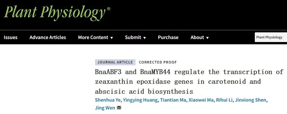 近日,油菜遗传育种团队在Plant Physiology发表了题为“BnaABF3 and BnaMYB44 regulate the transcription of zeaxanthin epoxidase genes in carotenoid and abscisic acid biosynthesis”的研究论文。该研究解析了甘蓝型油菜类胡萝卜素和脱落酸(ABA)生物合成关键基因BnaZEPs 的复杂调控机制。