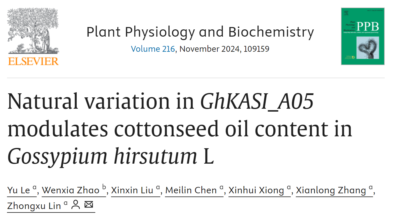 10月1日,棉花遗传改良团队在Plant Physiology and Biochemistry 期刊发表了题为“Natural variation in GhKASI_A05 modulates cottonseed oil content in Gossypium hirsutum L”的研究论文。该研究解析了棉花β-酮酰基-[酰基载体蛋白]合成酶(GhKASI)调节棉籽油积累的分子机制。