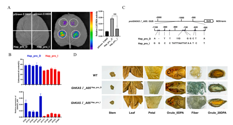 该研究利用503份陆地棉种质资源群体,以脂肪酸代谢路径的相关基因进行候选基因关联分析,发现位于A亚组的KASI(GhKASI_A05)与棉籽油含量(SOC)显著相关。为了确定该基因调节棉籽油的分子机制,该研究在高油种质(Hap_pro_D)和低油种质(Hap_pro_I)中对GhKASI_A05进行序列分析,发现位于GhKASI_A05启动子上的一个11bp的插入缺失(Indel)与SOC显著关联,开发的相关标记获批国家发明专利(陆地棉棉仁含油量基因GhKAS1的分子标记及其筛选方法,ZL201810200184.4)。启动子活性分析,GUS染色分析表明该变异影响GhKASI_A05的基因表达水平。