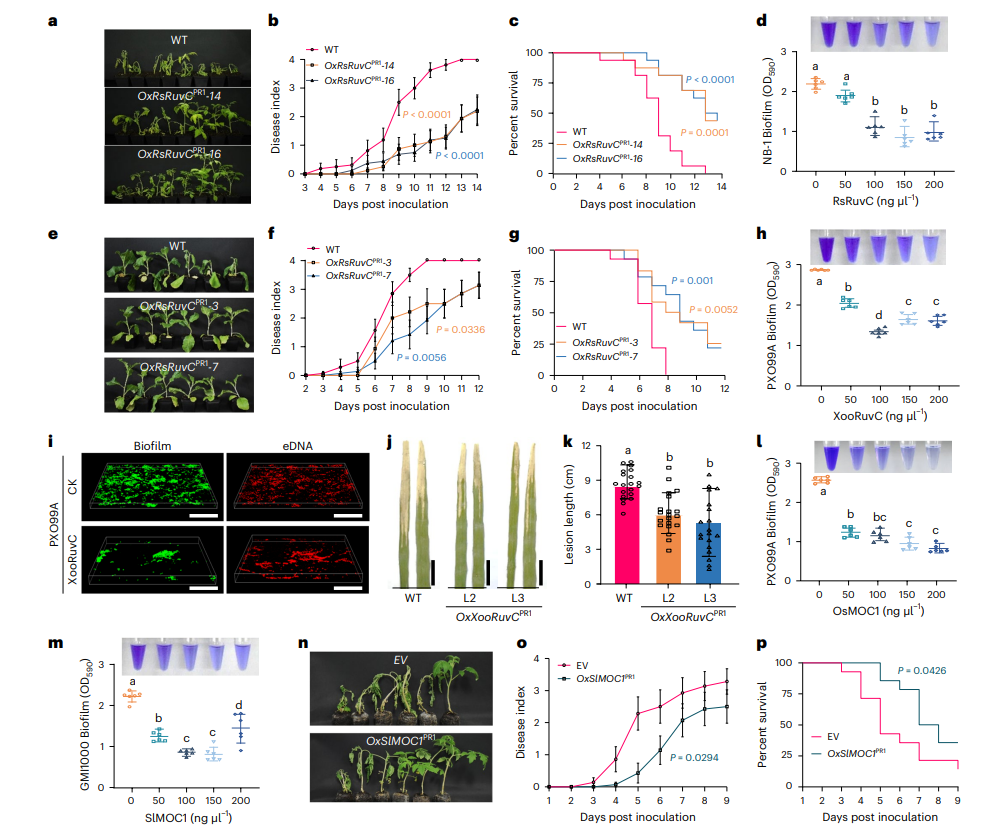 基于HJ结构解离酶对青枯菌生物膜的调控功能,研究团队创新性地设计了利用病原菌自身核酸酶靶向生物膜提高作物抗病性的思路,创制了一系列广谱抗作物维管束细菌病害的新型种质材料。将植物病程相关蛋白PR1的分泌信号肽与青枯菌RuvC蛋白融合表达,转化获得表达该分泌蛋白的番茄和烟草,发现转基因材料提高了茄科作物不同青枯菌菌株的抗病性,青枯菌侵染后的番茄和烟草存活率提高约50%。此外在水稻Nipponbare背景中表达具有信号肽的水稻黄单胞菌同源蛋白XooRuvC,发现转基因水稻对白叶枯病的抗病性显著提高。