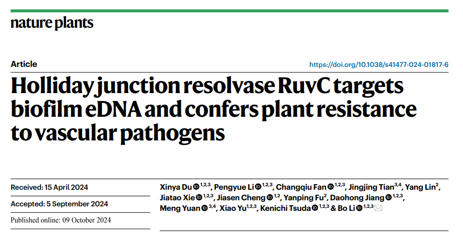 植物病害绿色防控团队李博教授课题组在国际权威期刊Nature Plants上发表了题为“Holliday junction resolvase RuvC targets biofilm eDNA and confers plant resistance to vascular pathogens”的研究论文,揭示了青枯菌如何利用霍利迪连接体解离酶RuvC促进成熟的生物膜解离和细菌扩散的分子机制,并且通过靶向生物膜形成创制了对青枯菌具有广谱抗性的番茄新种质,相关抗病改良策略在水稻白叶枯病中也得到了验证。本项研究为发掘和创制抗维管束病害资源提供了新思路,为培育持久抗病品种提供了有应用价值的新资源。