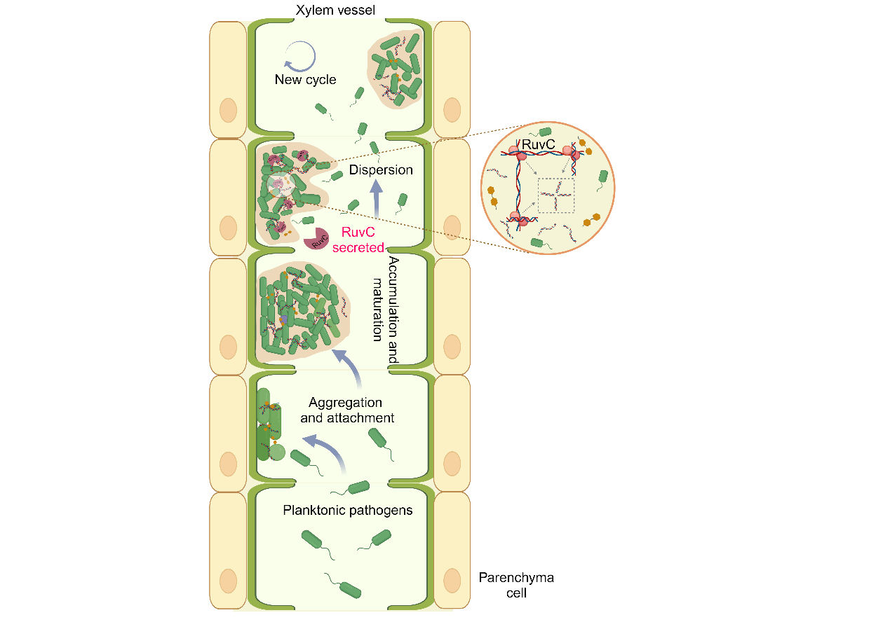 通过蛋白组学质谱分析青枯菌GMI1000生物膜蛋白质组,鉴定到高丰度霍利迪结构Holliday junction (HJ)解离酶RuvC。在青枯菌中敲除RuvC影响对番茄致病力和抑制了青枯菌在木质部内的扩散和迁移。分析发现敲除突变体导致生物膜和eDNA过度积累,同时eDNA的网格状结构在RuvC突变体中明显加强,证明了RuvC负调节青枯菌生物膜eDNA形成。为了解析RuvC作用于eDNA的功能机制,研究发现RuvC能够分泌到细菌胞外,并且和生物膜eDNA类霍利迪结构有共定位,体外酶学活性实验证明了RuvC能够降解具有十字形结构的DNA,并证明其解离酶活性是青枯菌毒力所必须的。在体外生物膜培养系统中添加RuvC重组蛋白可以显著抑制青枯菌生物膜的形成,通过检测青枯菌RuvC在体外和番茄木质部内的表达动态,发现RuvC在生物膜成熟后期受诱导表达。综合以上研究结果提出了青枯菌生物膜动态的调控模型:在定殖早期青枯菌形成生物膜占据生态空间并进行繁殖,在生物成熟后营养和空间不足,细菌分泌RuvC降解eDNA的类霍利迪结构,使部分生物膜解体促进细菌扩散和侵染。
