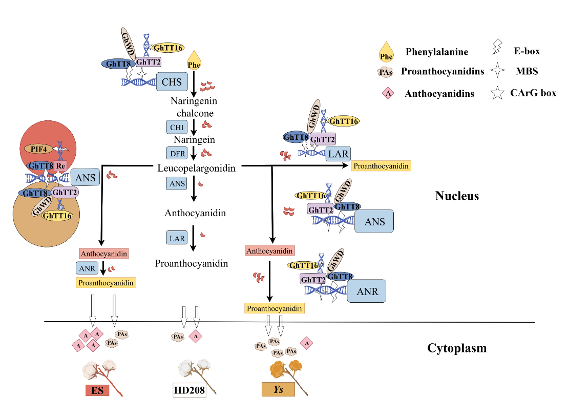 随后,该团队对这两个基因展开了对棕色棉生成的遗传机制和调控网络的探究。首先对介导棕色棉颜色产生的Gh_TT2 进行PCR扩增,发现该基因在白色棉花HD208和棕色棉Ys 中表达量及序列均存在差异,表现为两种单倍型。Gh_TT2在纤维发育的5-15 DPA(days post anther) 特异且高量表达,且在Ys中的表达量显著高于HD208。原花青素合成路径的关键酶(proanthocyanidins biosynthesis genes,PABGs)与其呈现一致的趋势。与白色棉花单倍型(Gh_tt2HD208)相比,编码区单个SNP的突变引起了氨基酸的转变。为探究编码区变异对表型呈现的影响,作者利用纤维特异启动子pGbEXPA2驱动两种单倍型在转化受体Jin668中表达,发现两种单倍型的转化系均能产生棕色的纤维。对转化系5-15 DPA的纤维取样,并测定色素含量以及Gh_TT2和PABGs的表达量,发现在棕色棉单倍型(Gh_TT2Ys)的转化系中,色素含量以及相关基因表达量最高,Gh_tt2HD208的次之,两者均显著高于对照。上述结果表明,Gh_TT2在纤维发育时期中的高量表达与棕色纤维中原花青素的形成和沉积密切相关,而编码区的SNP变异可能会影响PABGs的表达。